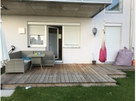 Sonnige Wohnung mit Terrasse und Garten in Korneuburg / mit Kaufoption. Großer Vorraum, Badezimmer mit Wanne, WC extra, Abstellraum, Schlafzimmer, Küche und großes Wohnzimmer mit Glasfront zum Gart...
