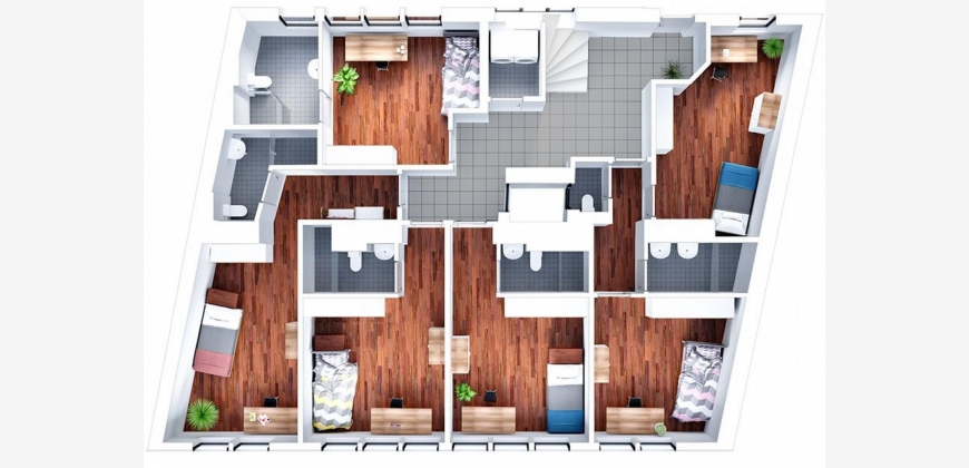 - eigene 1-Zimmer Wohnung ausgesattet mit Bett, Schreibtisch und Sitzmöbeln, eigenes Badezimmer und WC.