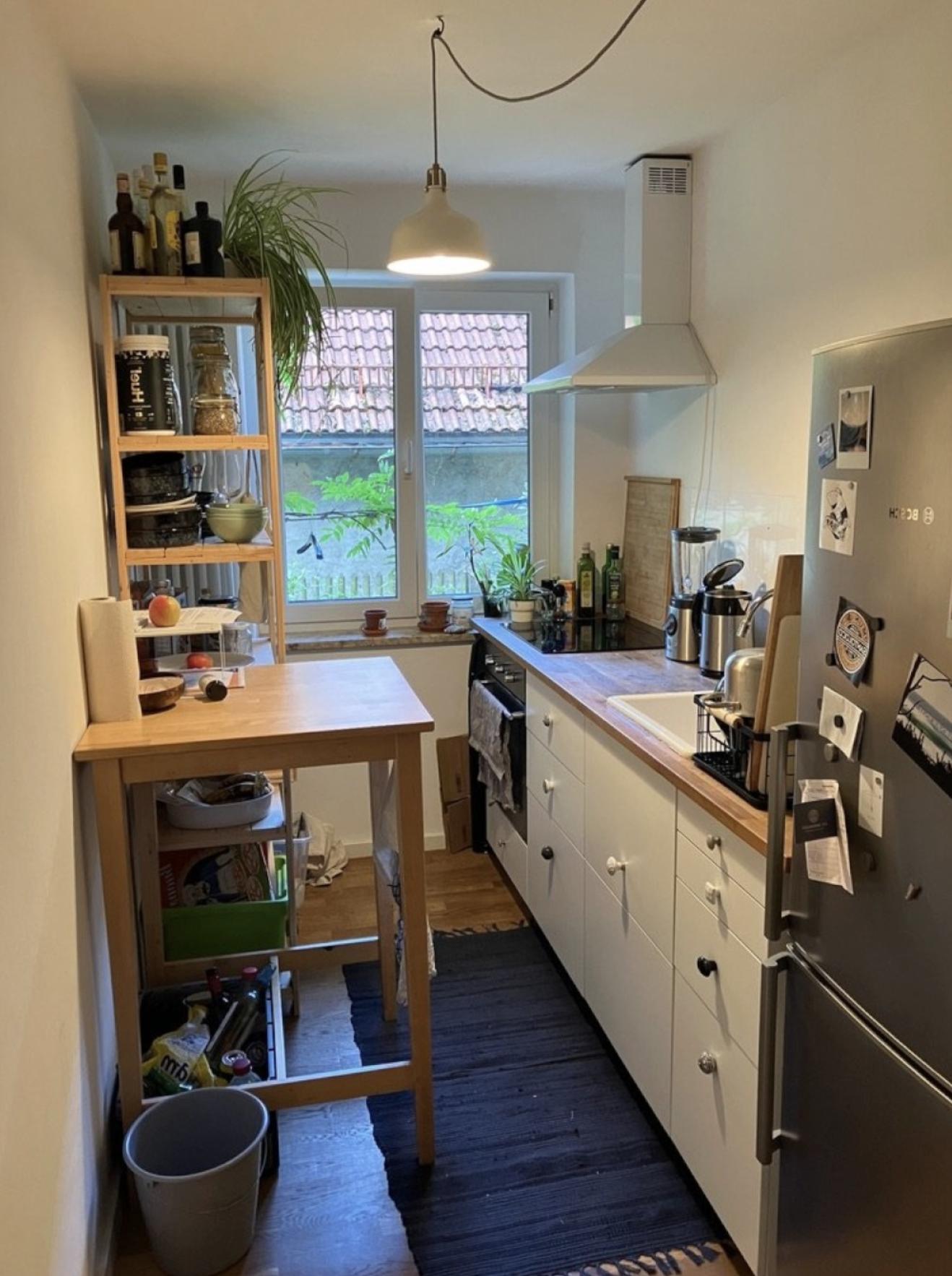 Die Wohnung hat ein Wohnzimmer und ein Schlafzimmer und genug Stauraum. Der Flur verbindet alle Zimmer und führt in das große Wohnzimmer. Dieses besitzt 4m hohe Decken und Zugang zu einem kleinen Garten auf dem man vormittags in der Sonne sitzen kann. Bad (mit Badewanne) und Küche haben alles was man zum Wohnen benötigt.