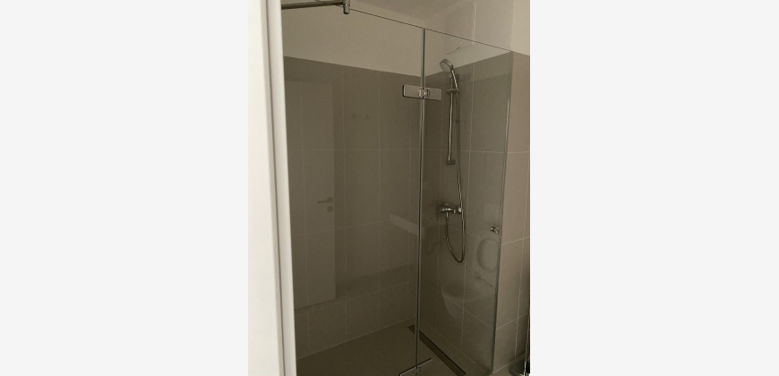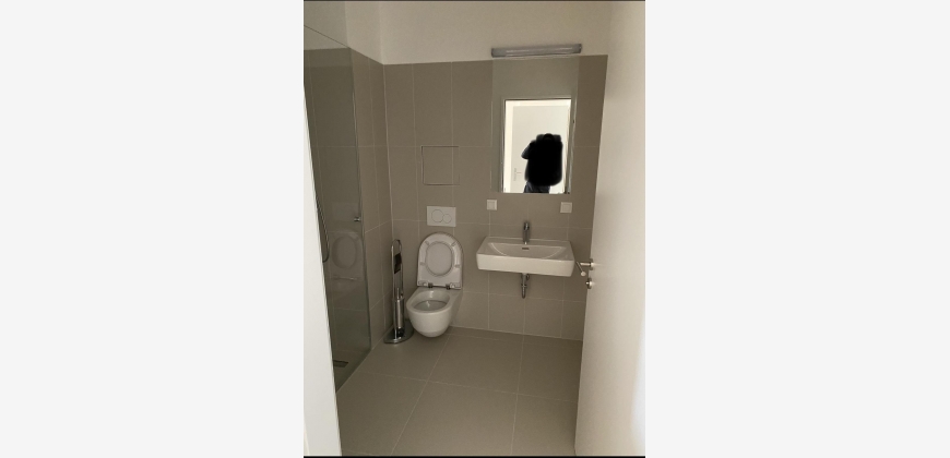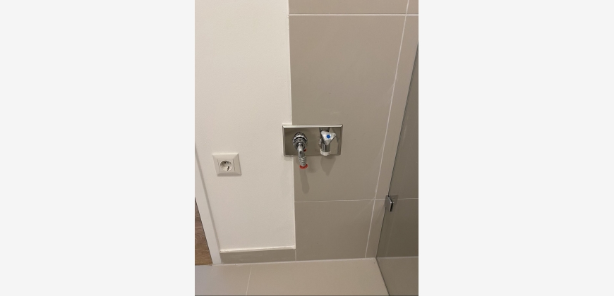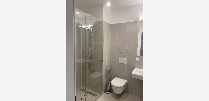 Das moderne Badezimmer hat eine bodentiefe Dusche, WC und einen Waschmaschinenanschluss