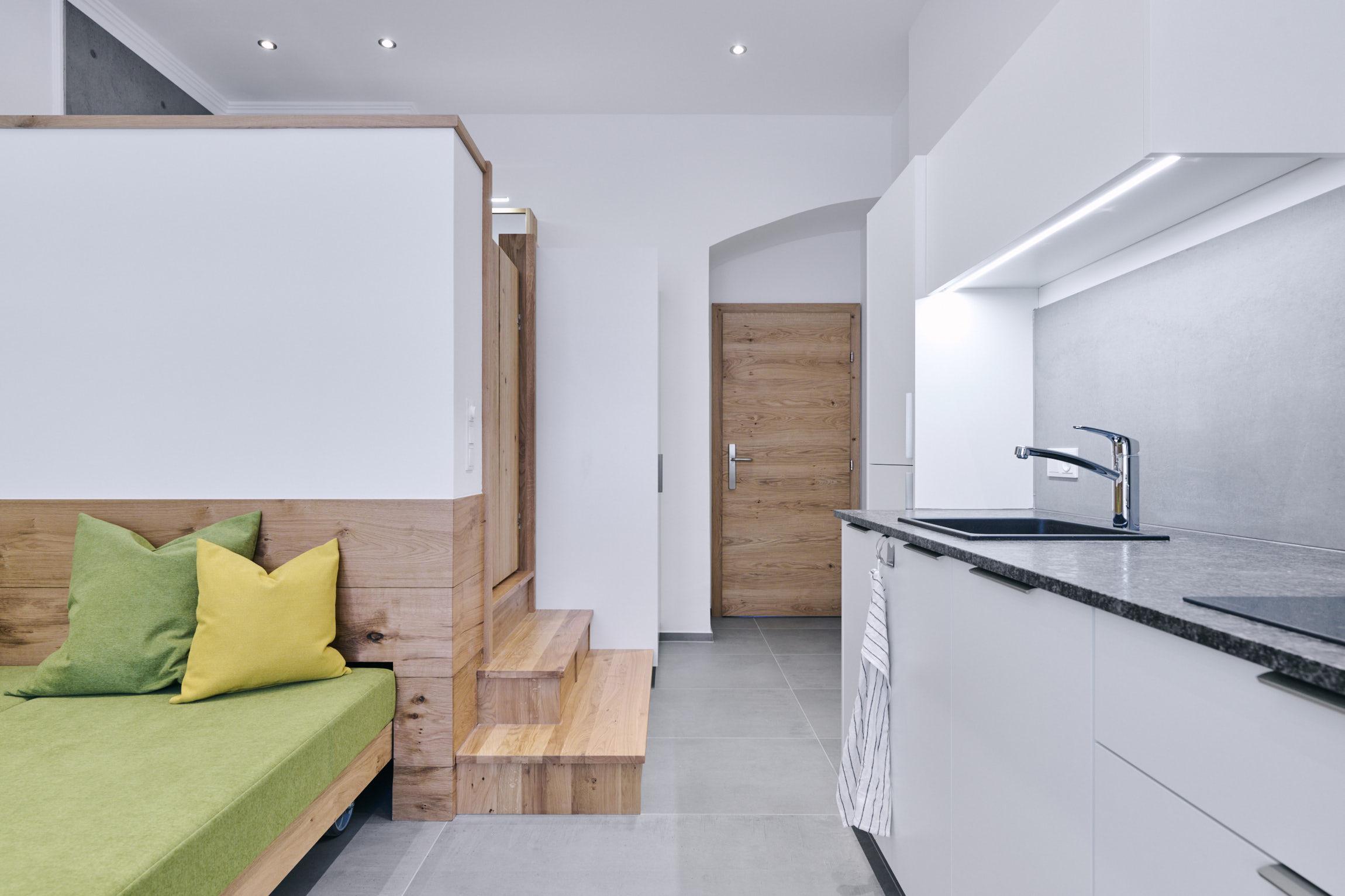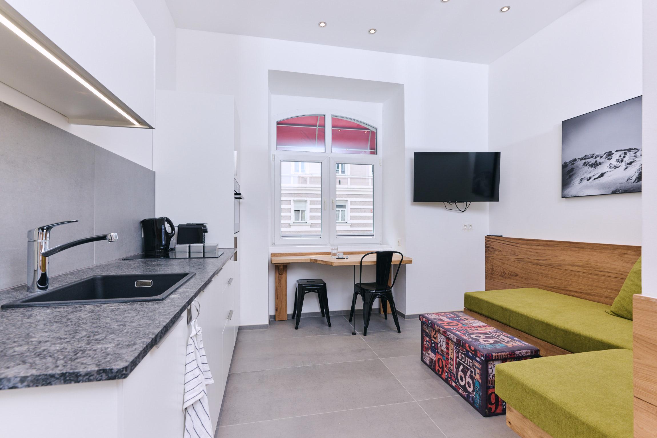 Das Mikro-Apartment ist vollmöbliert und mit Smart-TV, Klimaanlage, Nespresso-Kaffeemaschine, Teekocher, Geschirr, Bettwäsche und Handtücher ausgestattet. Die Küche bietet Kühlschrank mit Gefrierfach, Geschirrspüler, Backrohr/Mikrowelle und Induktionskochfeld. Der Preis beinhaltet alle Nebenkosten (auch Heizung und Strom), gratis WLAN und monatliche Grundreinigung (inkl. Austausch der Bettwäsche und Handtücher). Weiters steht auch ein Gemeinschaftswaschraum mit Waschmaschine, Trockner, Bügeleisen und Staubsauger kostenfrei zur Verfügung. Die Aufenthaltsdauer beträgt maximal 6 Monate, ist aber nach Ablauf verlängerbar.