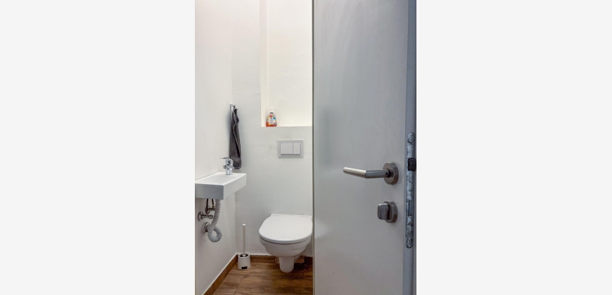 Es grenzt nur an ein weiteres Zimmer und liegt direkt am Flur, von dem aus du Bad und Eingangstür schnell erreichst.