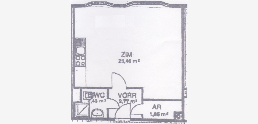 Die Wohnung verfügt über ein Wohn-Schlafraum mit einer Einbauküche, einen Vorraum, einen Abstellraum und ein Badezimmer mit WC, Waschbecken und Dusche.