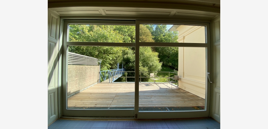 2 Schlafzimmer sind vom Vorraum zu begehen, ebenso das 30 m2-Wohnzimmer mit großer Glas-Schiebetüre auf die 24 m2 Terrasse mit Brücke zum Garten.