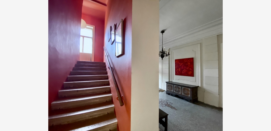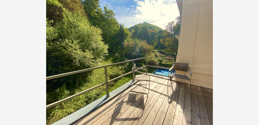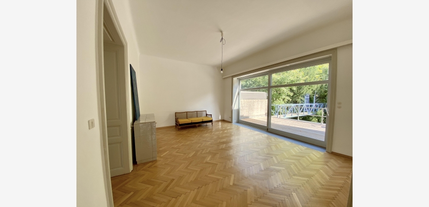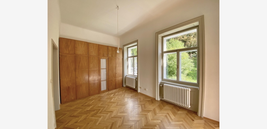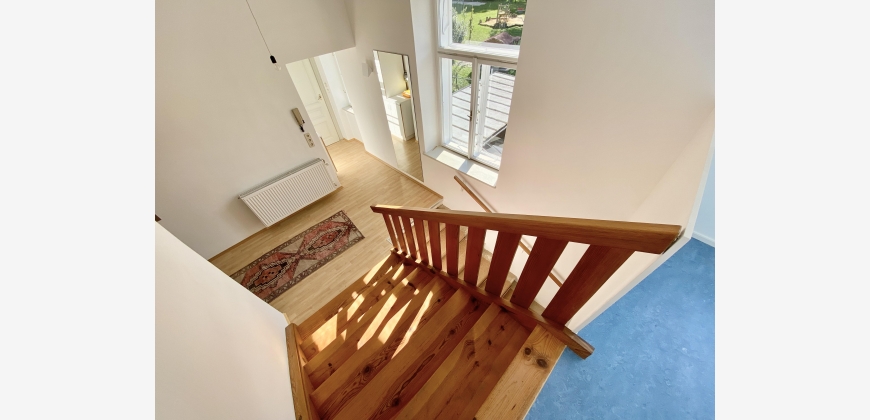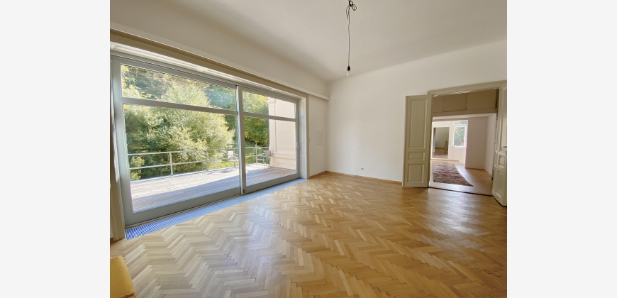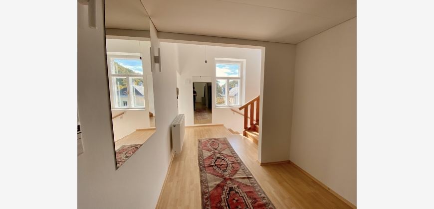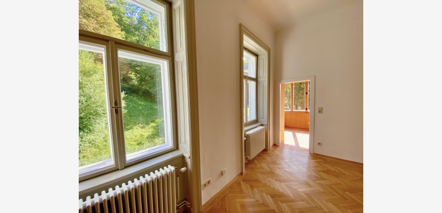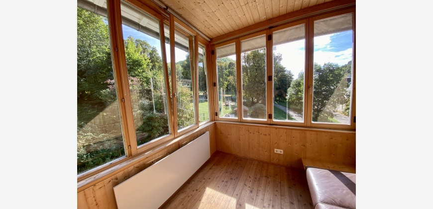 Wohnung im Obergeschoß mit freiem Blick nach allen Seiten, 2022 renoviert, Parkettboden, Flügeltüren, Kachelofen, Raumhöhe 3,50 m, Kastenfenster, Terrassenboden und Bad sind erneuert.