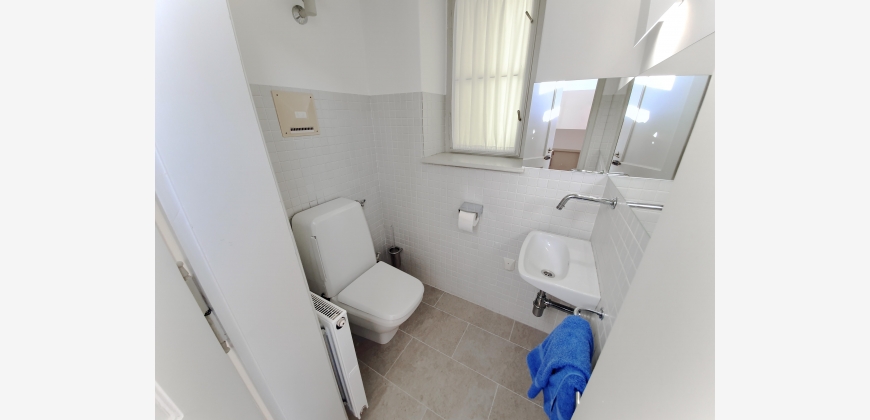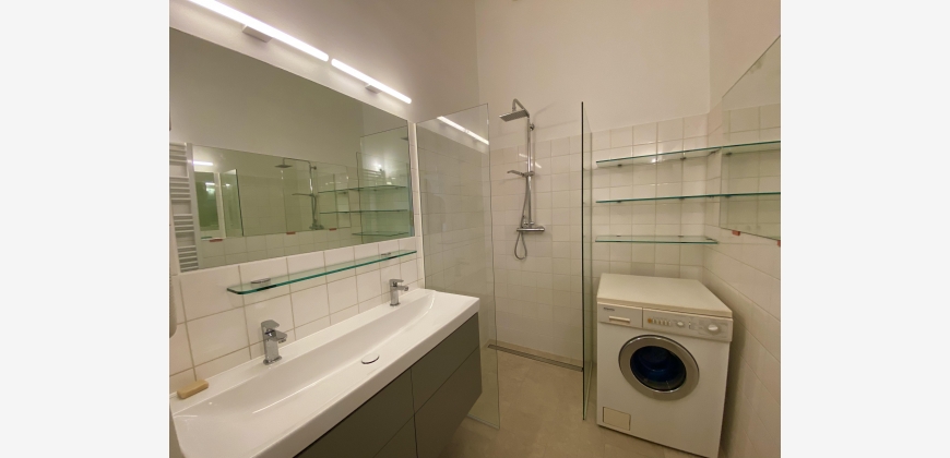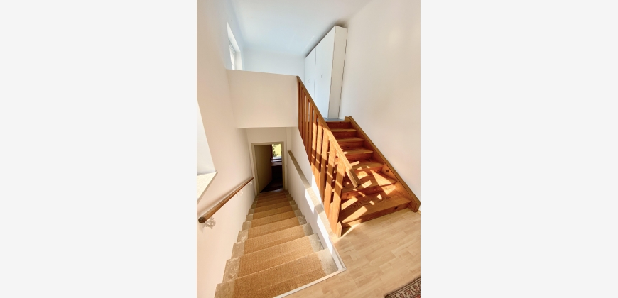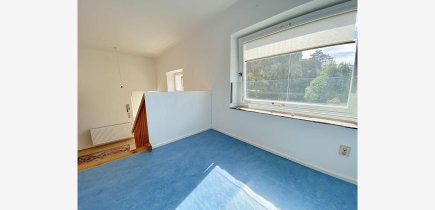 große Wohnküche mit Sicht auf das Rathaus. Ein Zubau mit Loggia-Charakter und freiem Blick ins Grüne ist mit dem Schlafzimmer verbunden. Ein erhöhter Platz ist gut geeignet als Home-Office. Bad mit neuem Sanitärmobiliar, WC extra, Vorraum und Flur. Ein weiteres WC befindet sich im Saunabereich (1. Stock)