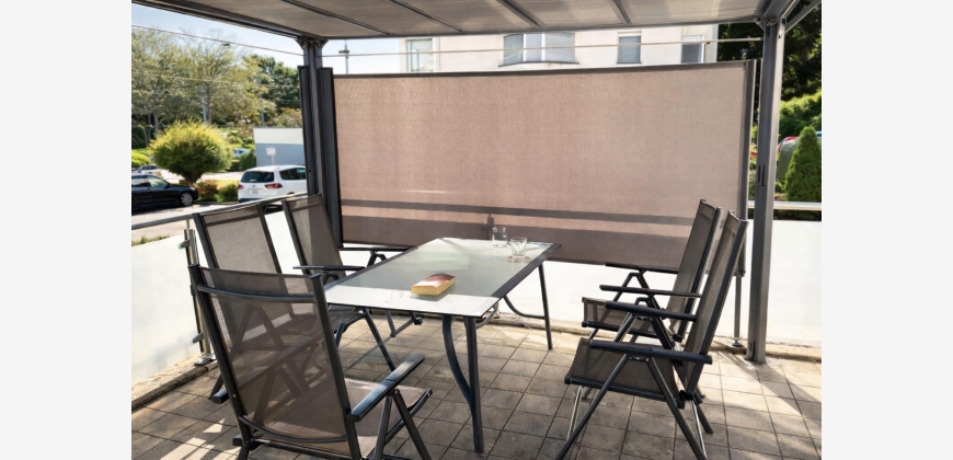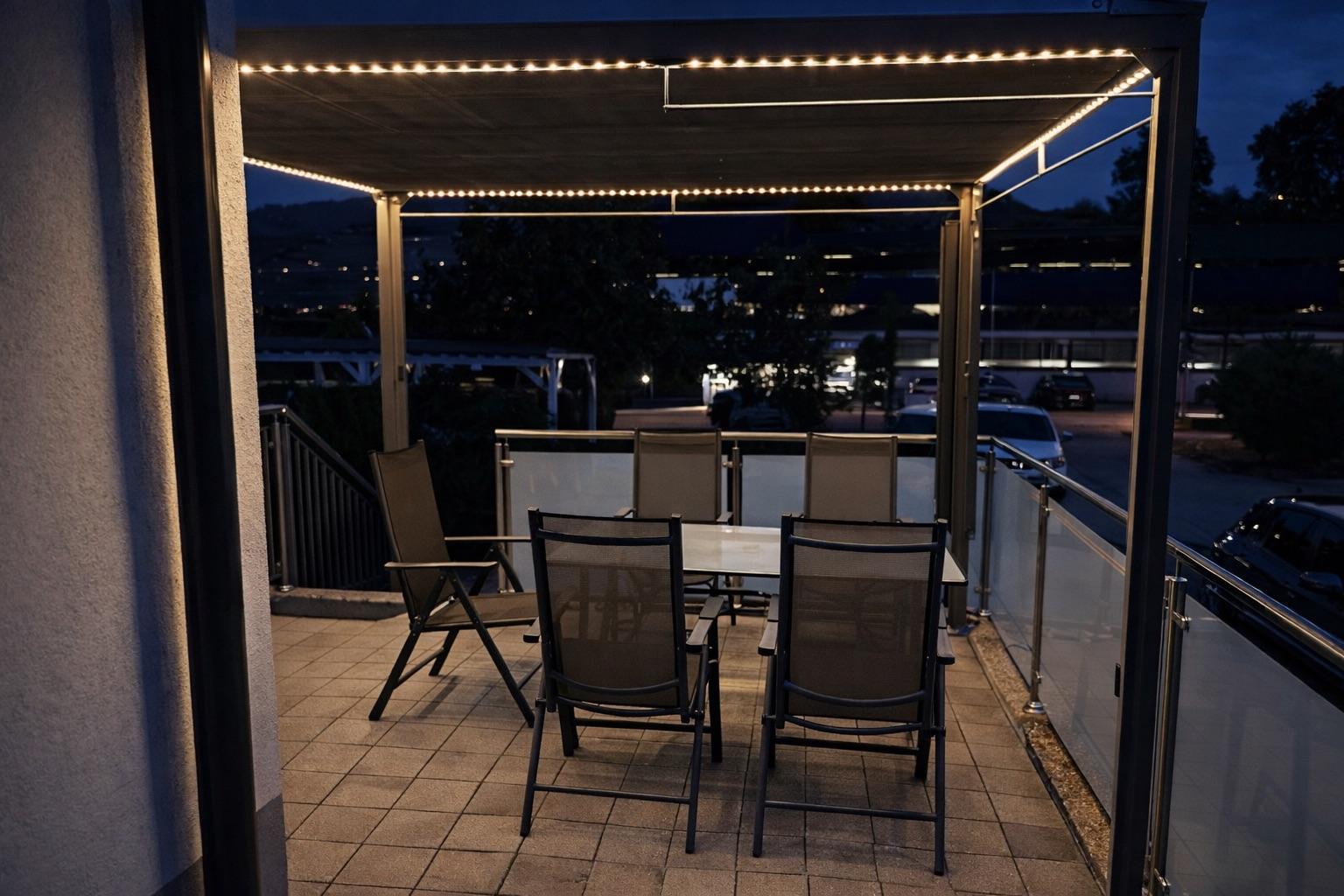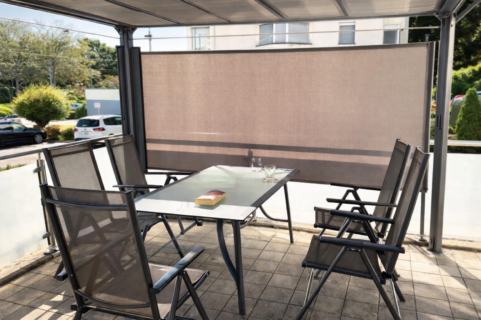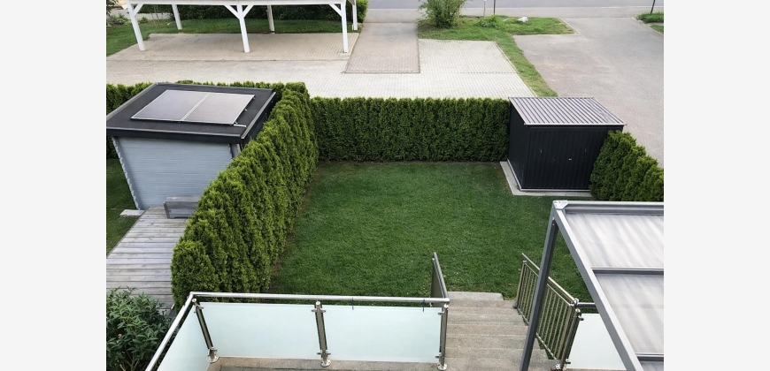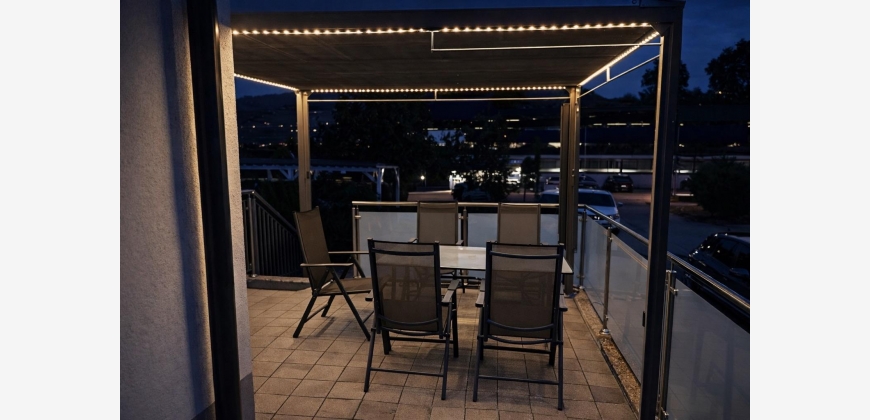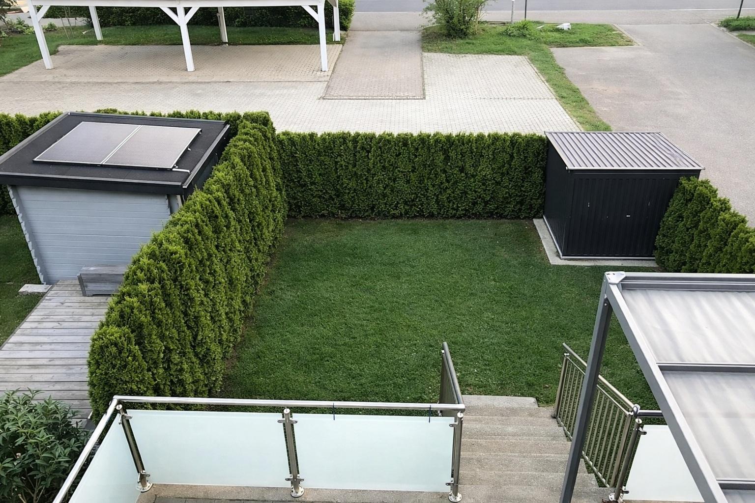 Die rund 28 m² große Terrasse mit einer elektrischen Pergola bildet gemeinsam mit dem über 50 m² großen Garten in Südausrichtung eine stimmige Freiluftzone mit viel Potenzial - ob als grüne Ruheoase oder privater Rückzugsort im Alltag.