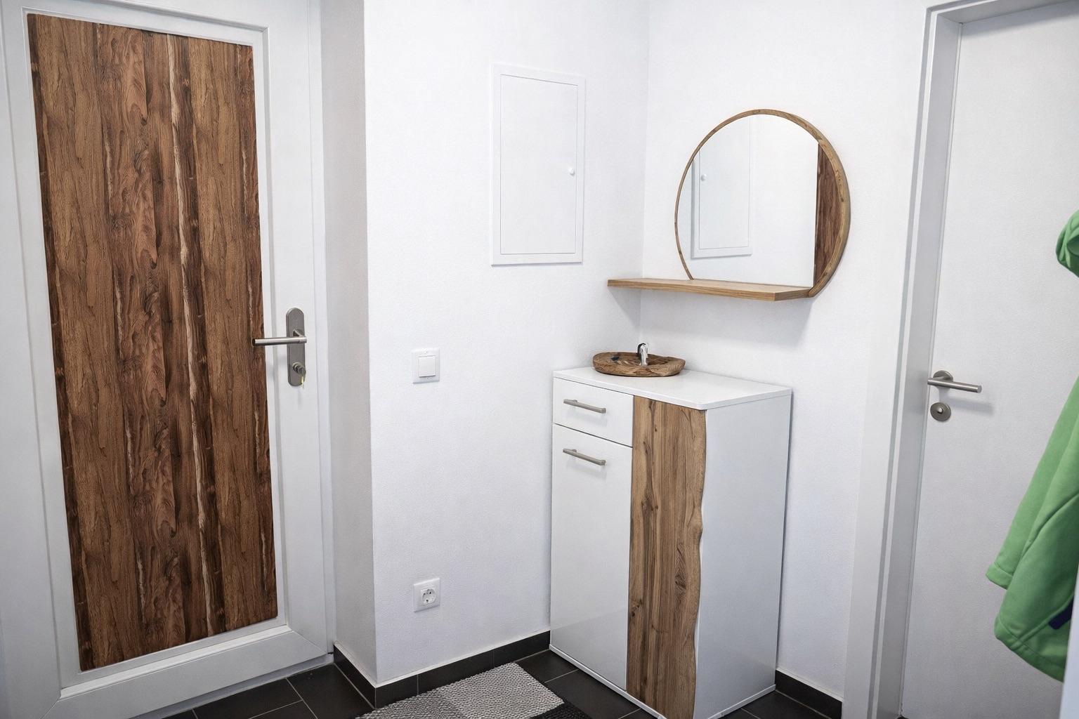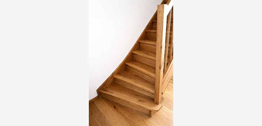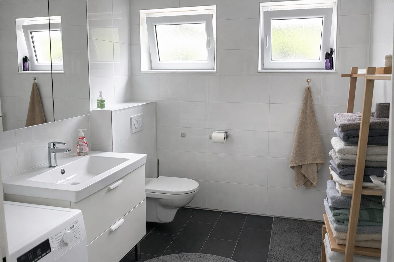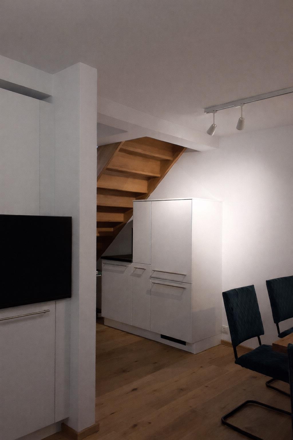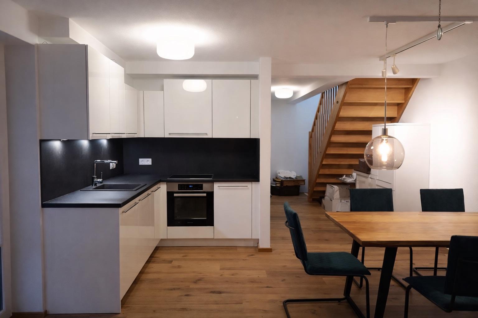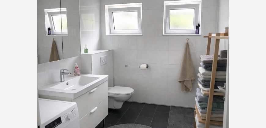 Der Vorraum schafft eine angenehme Eingangssituation mit einem WC im Untergeschoß und leitet weiter in den offen gestalteten Wohn-, Ess- und Kochbereich - ein einladender Mittelpunkt mit Zugang auf die großzügige Terrasse und den vorgelagerten südseitigen sonnigen Garten. Im Obergeschoß befinden sich die 2 Schlafzimmer und das Bad mit einem weiteren WC. Das Badezimmer ist stilvoll ausgestattet mit bodengleicher Dusche und hochwertigen Sanitärkeramiken.