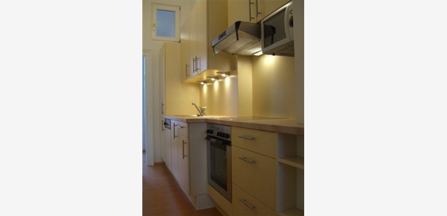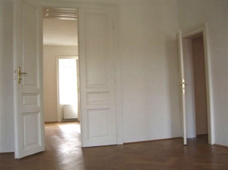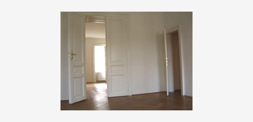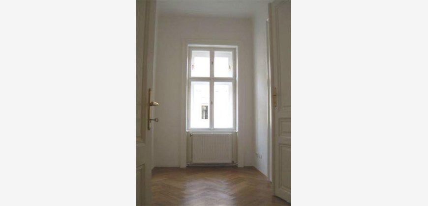 Wohnzimmer, Schlafzimmer und Kabinett mit Parkettboden, Flügeltüren, Kabel- und Telefonanschluss, Gasetagenheizung, 6 Fenster.