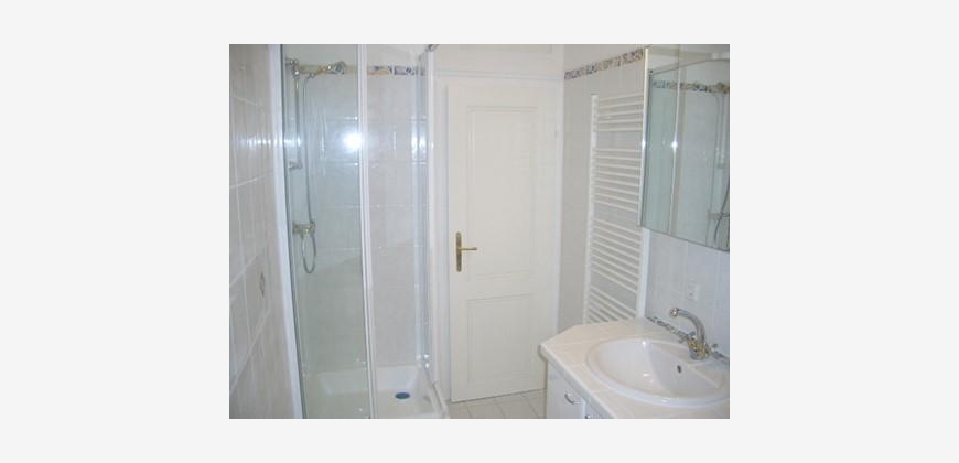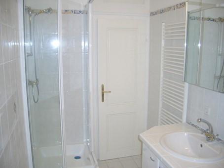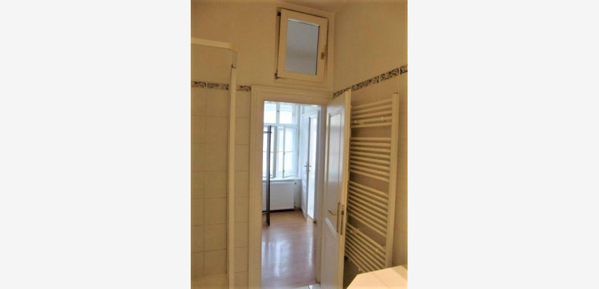 Badezimmer ist weiß verfliest und verfügt über einen maßgefertigten Waschtisch mit Waschmaschinenanschluss, großer Spiegelkasten mit Lampen, silber-goldene Armaturen, Deckenspots, Handtuchtrockner, Kippfenster, elektrischer Entlüftung über Innenhof-Fenster, Heizkörper-Zelle, Badewanne und Dusche mit Kabine und Mischbrause-Armatur, eingebauter Kombi-Waschmaschine mit Trockner.