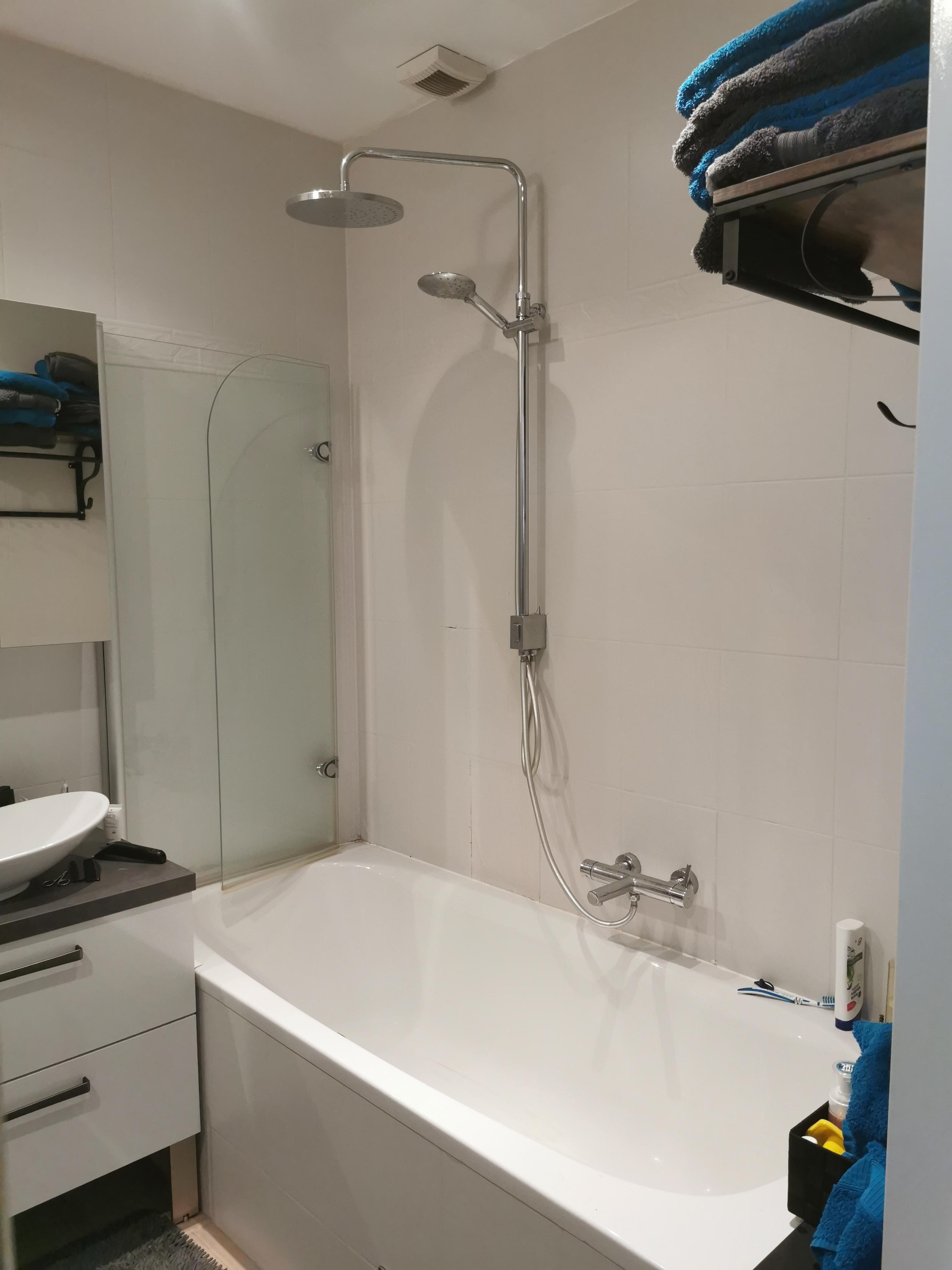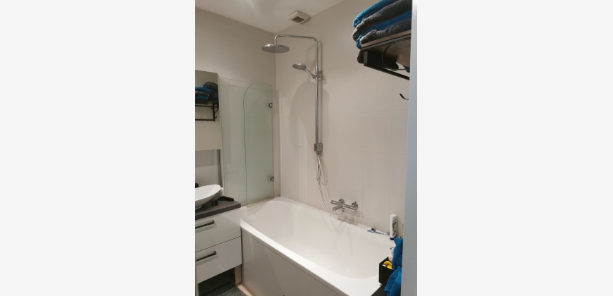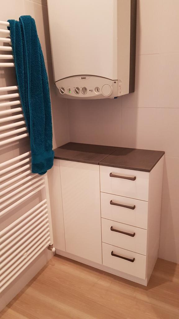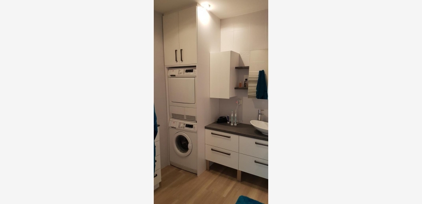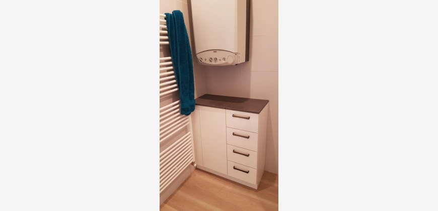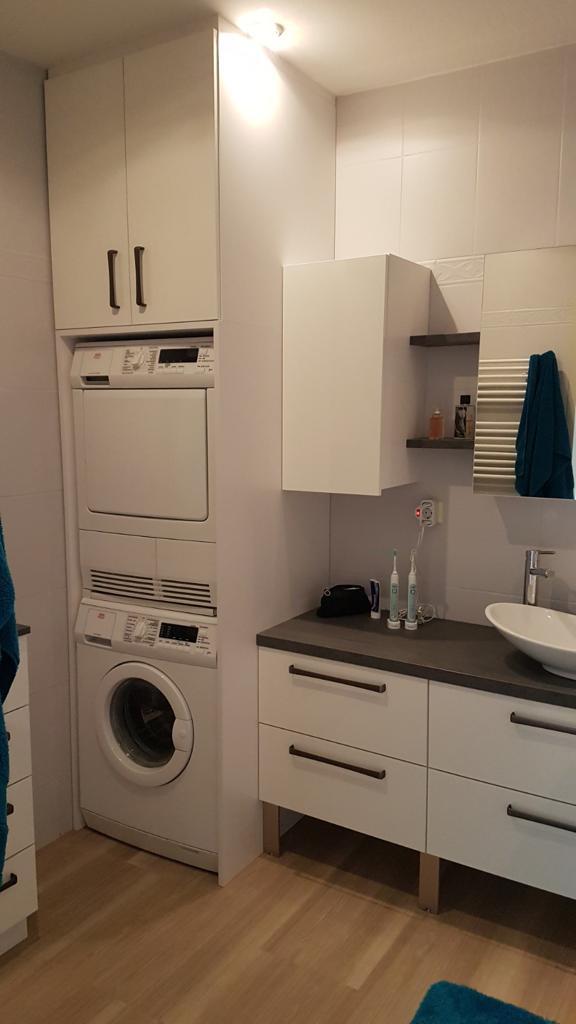 - Bad mit Maßmöbeln, Designerwaschbecken, Badewanne und Platz für Waschmaschine und Wäschetrockner