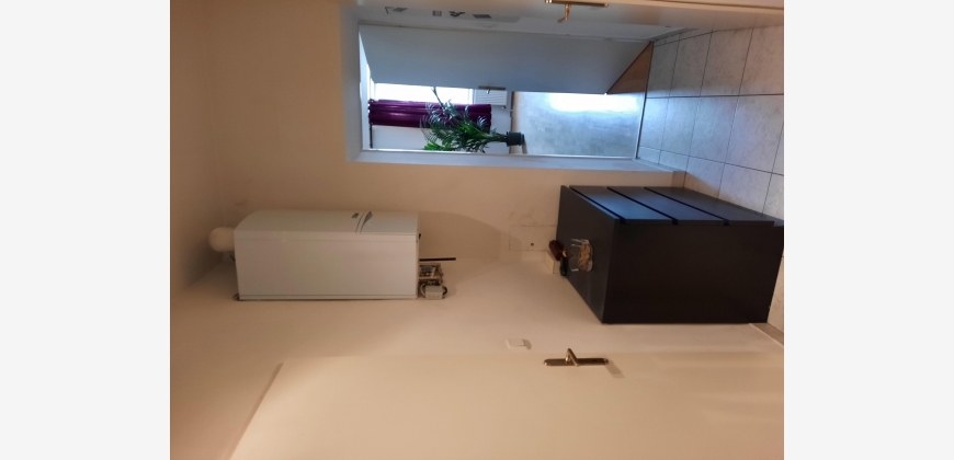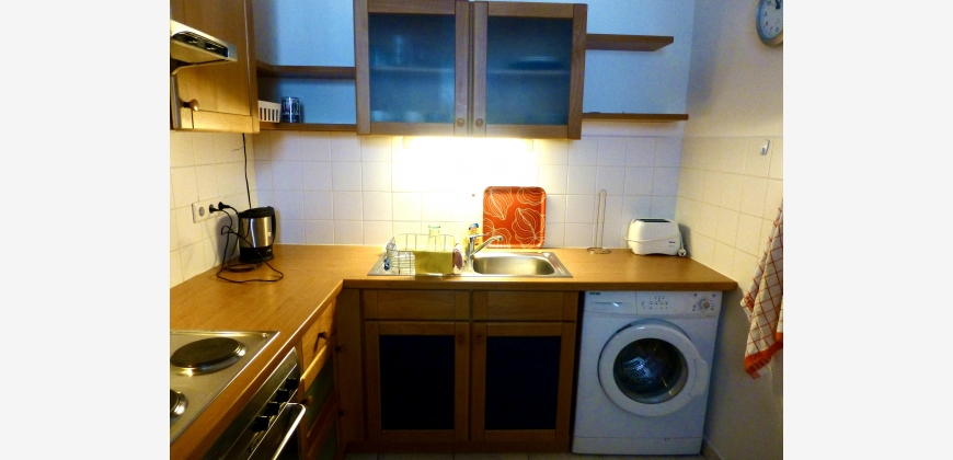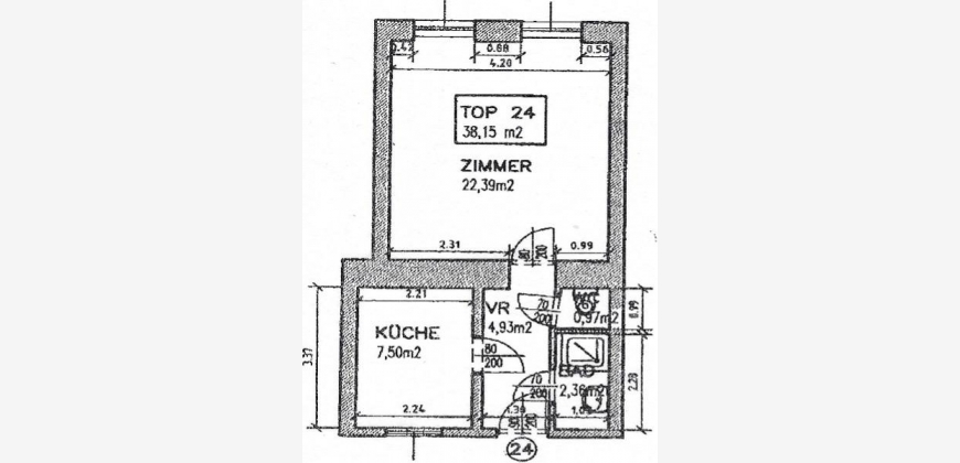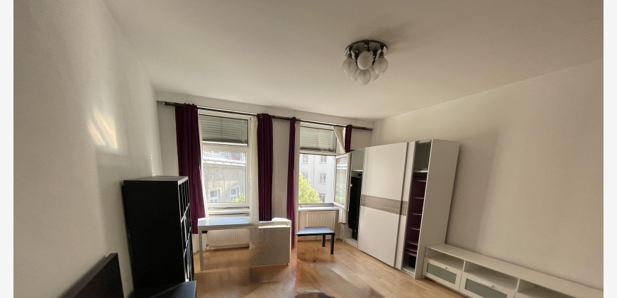Die Wohnung besteht aus einer vollmöblierten Küche mit Essplatz, einem 24m2 großen Wohn-/Schlafzimmer, einem Vorzimmer, Abstellraum und einem Bad mit Dusche und WC.