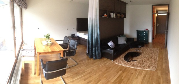 Der Boden ist mit durchgängigem Holzfußboden ausgestattet, das Bad ist verfließt.