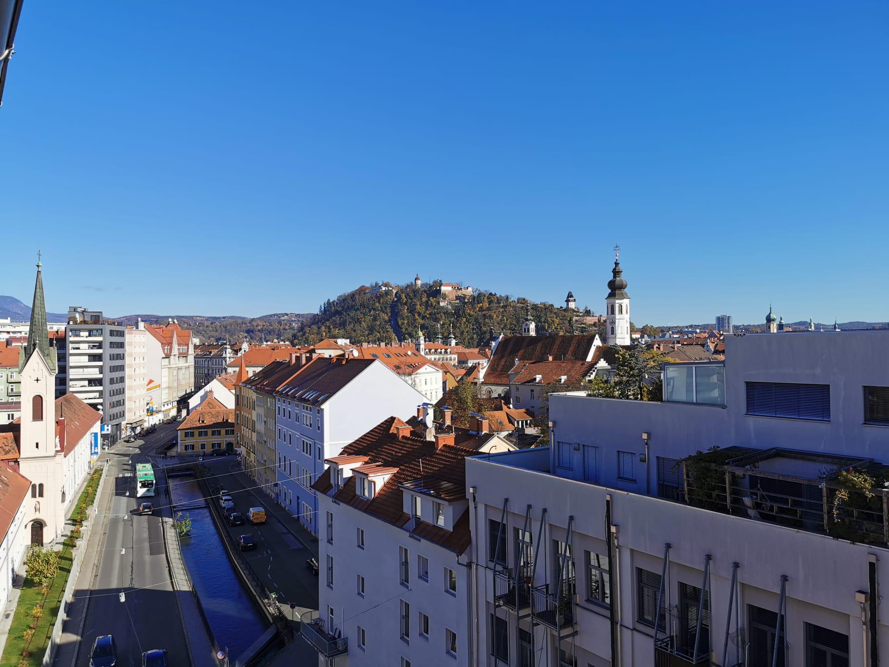 Mit Blick über Graz und auf den Uhrturm und wenige Gehminuten von öffentlichen Verkehrsmitteln und Einkaufsmöglichkeiten entfernt ist die Wohnung in Bezug auf Mobilität unschlagbar.