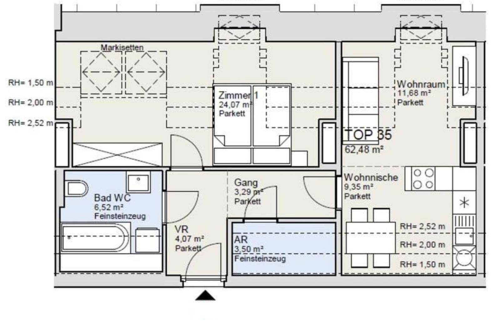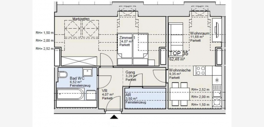 Diese großzügige 2-Zimmer Wohnung bietet neben einem geräumigen Wohn-, und Schlafzimmer auch ein modernes Wannenbad. Das Schlafzimmer ist innenhofseitig ausgerichtet und bietet dadurch eine angenehme Nachtruhe. Außerdem ist hier genügend Platz, dass neben einem Doppelbett und einem Schrank auch ein Bürobereich untergebracht werden kann.