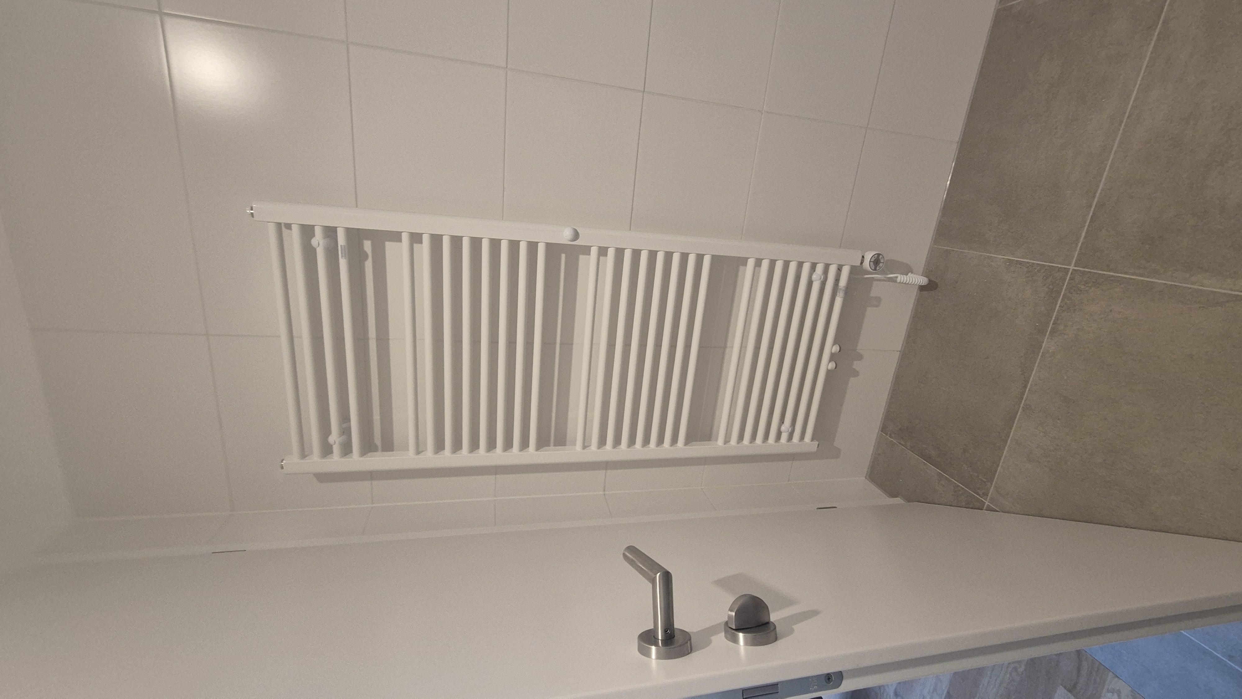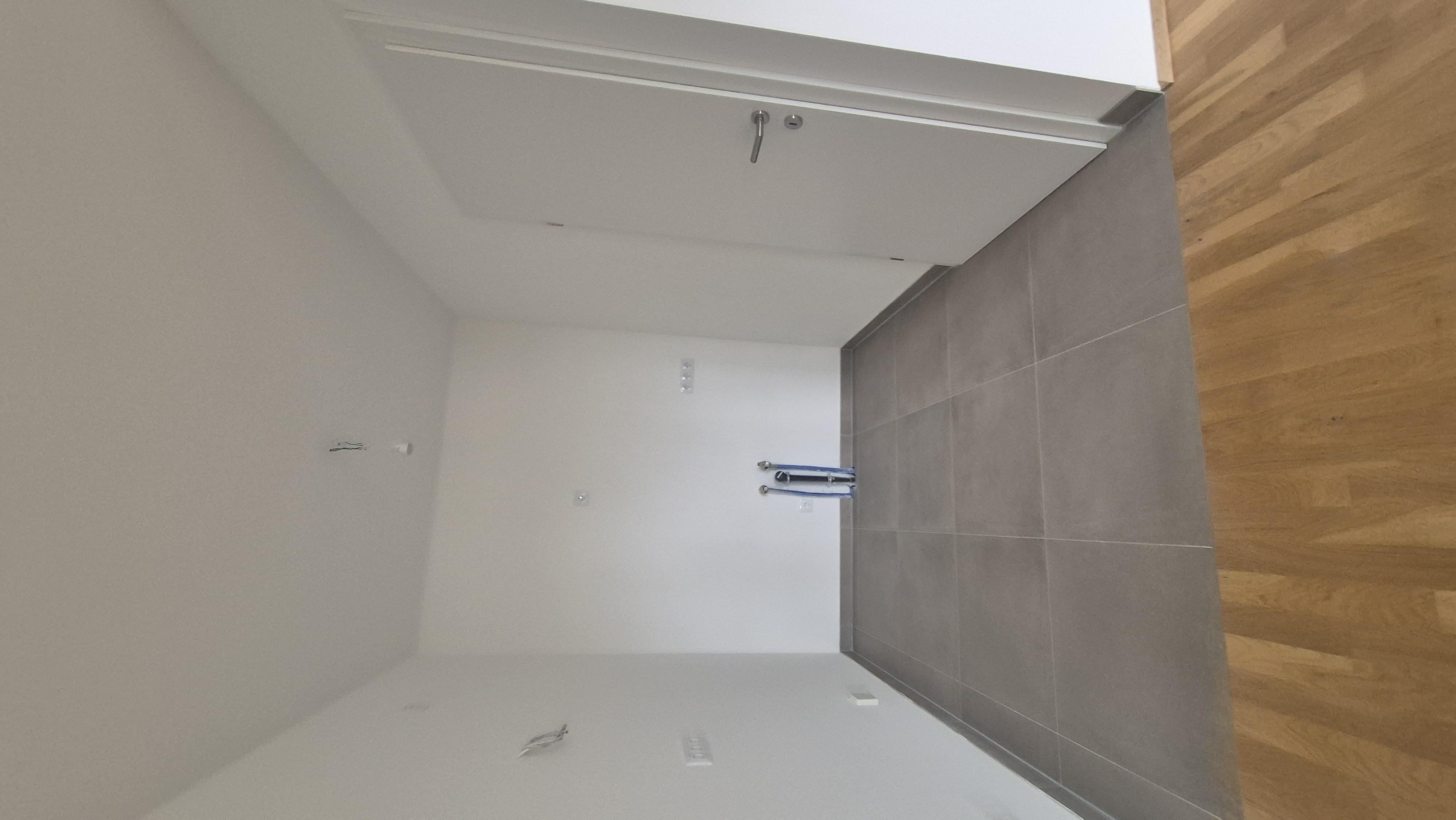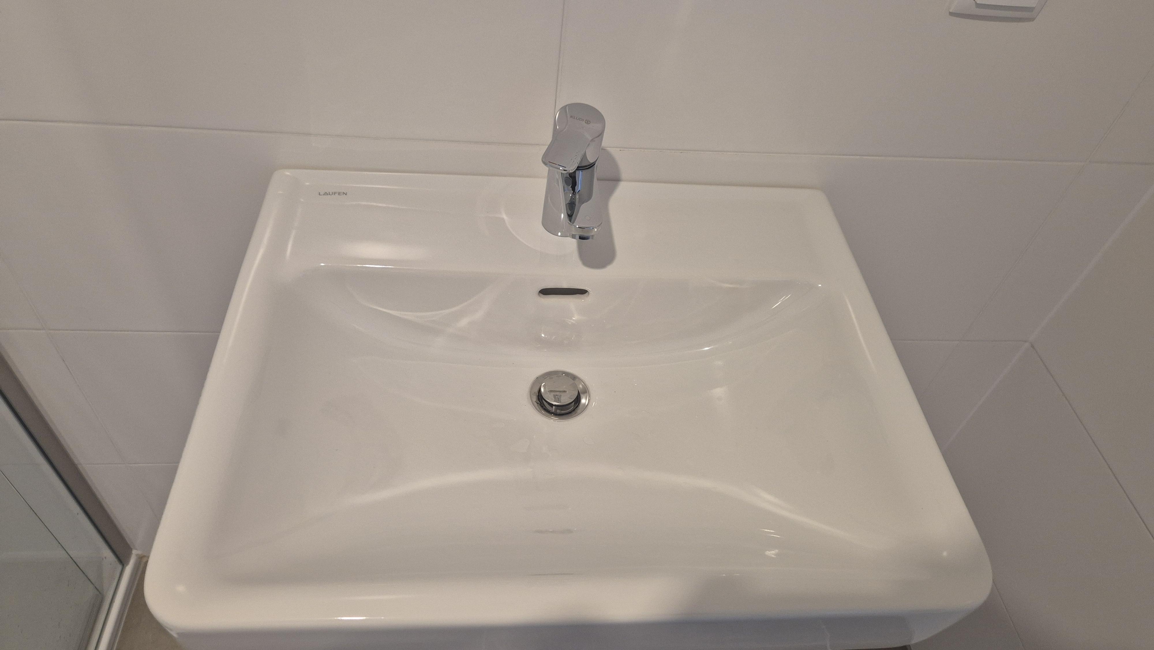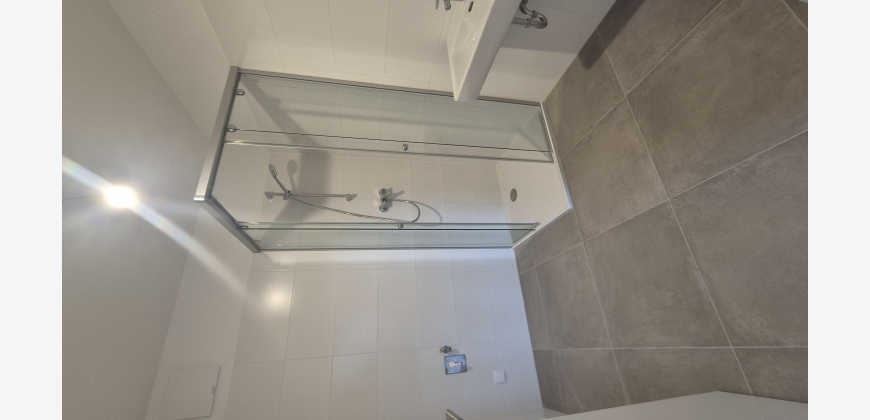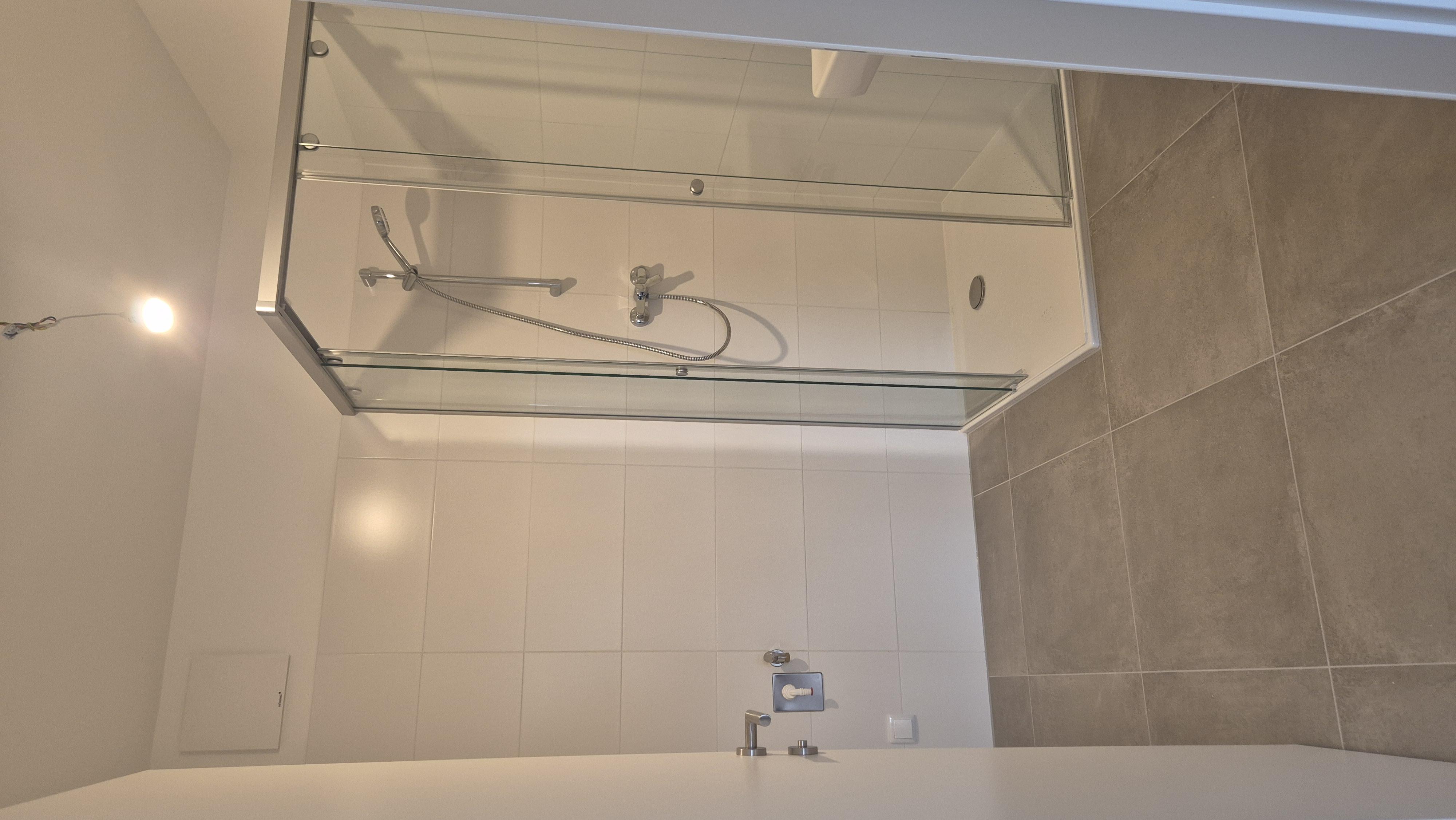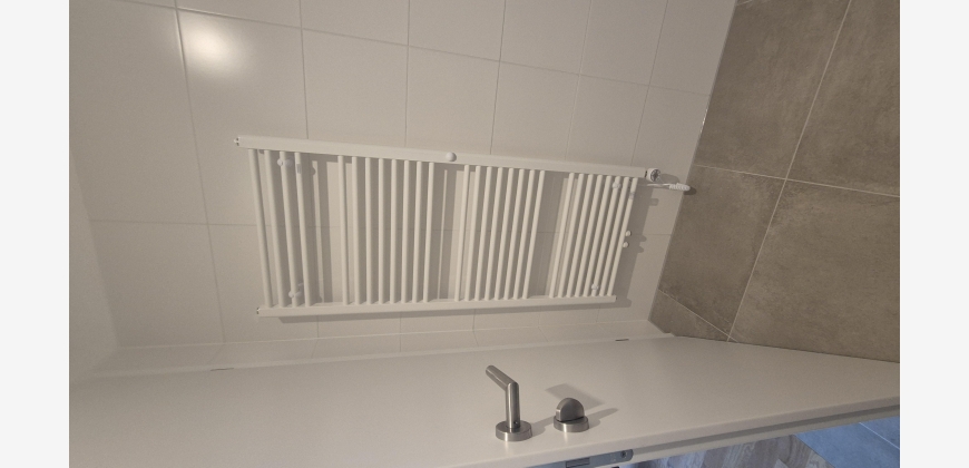+ geräumiges Badezimmer mit verglaster Duschkabine mit Glaswand, Handtuchheizkörper mit hochwertigen "Kludi" Armaturen und Spüle von "Laufen"
