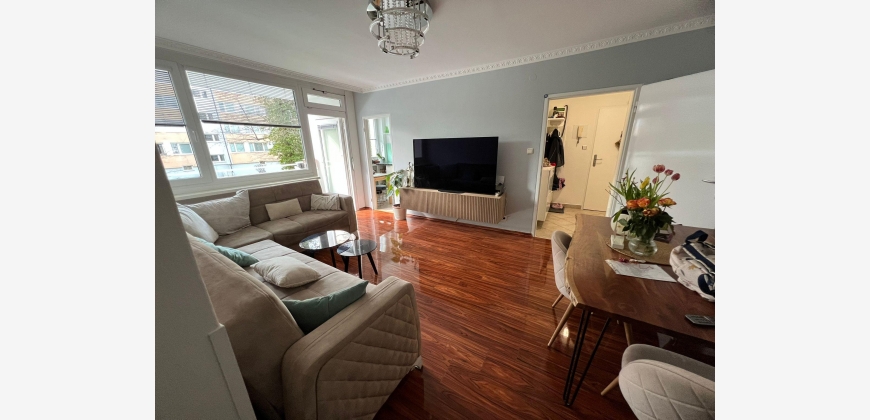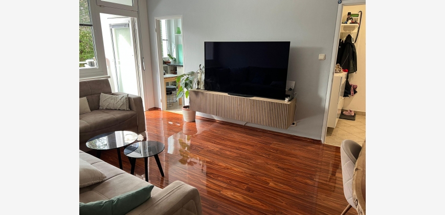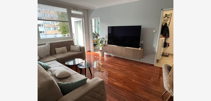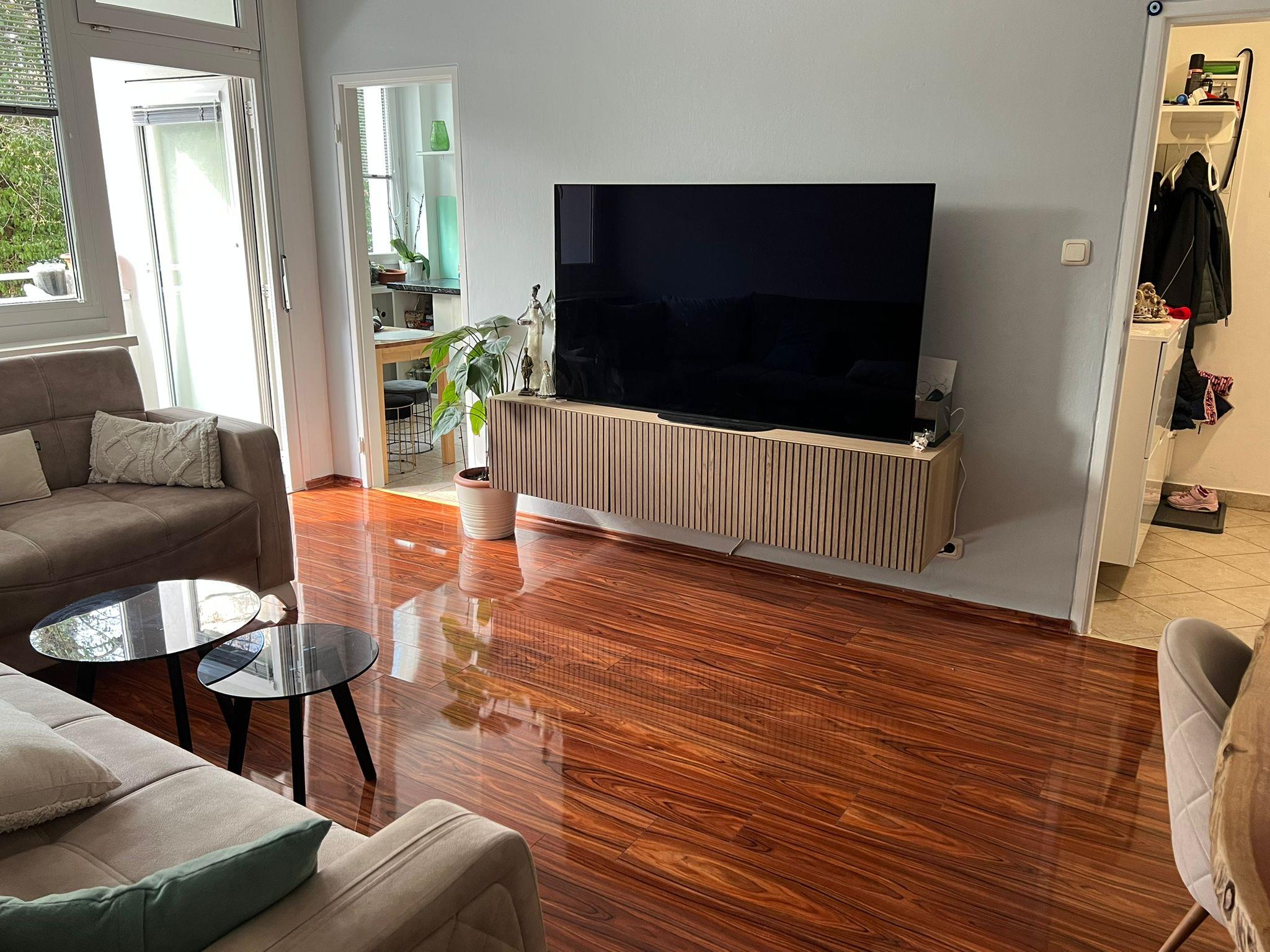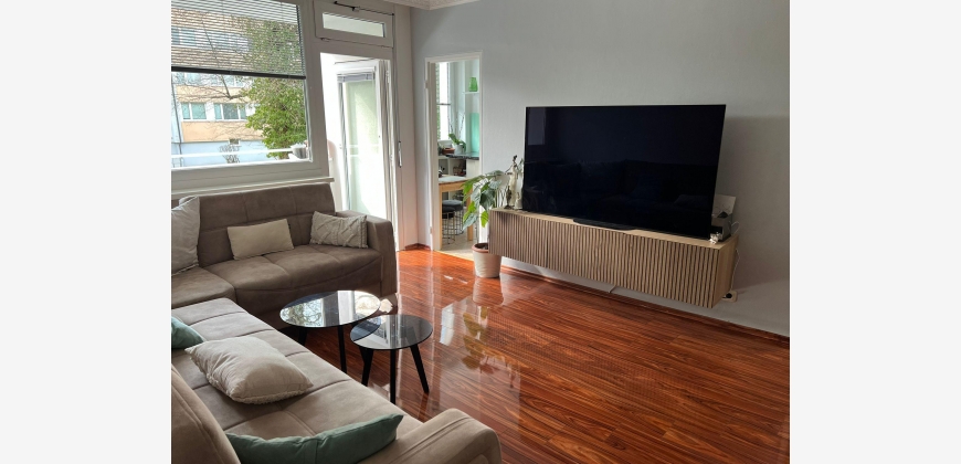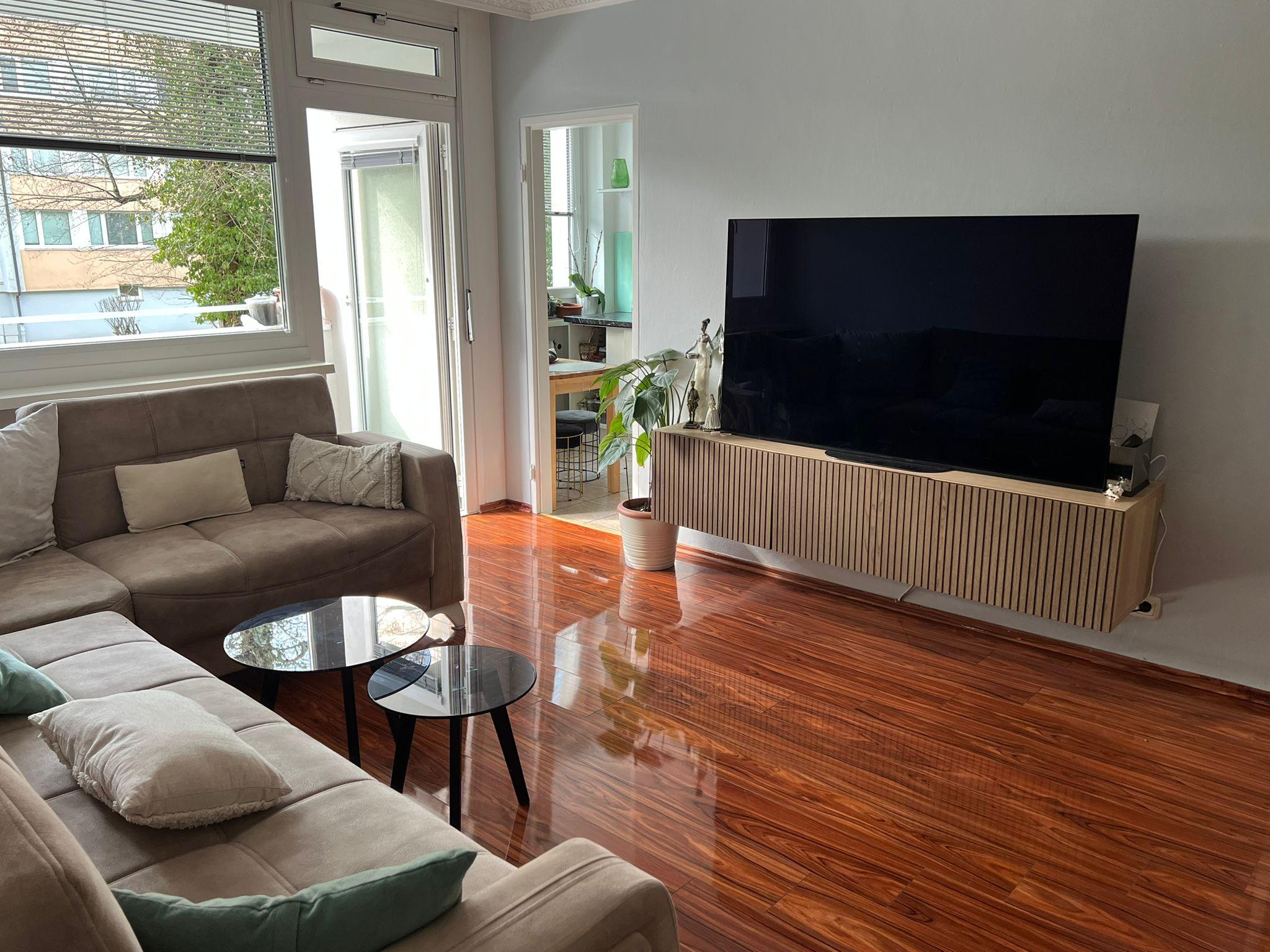 Der lichtdurchflutete Wohnbereich mit direktem Zugang zum Balkon bildet das Herzstück dieser Wohnung.