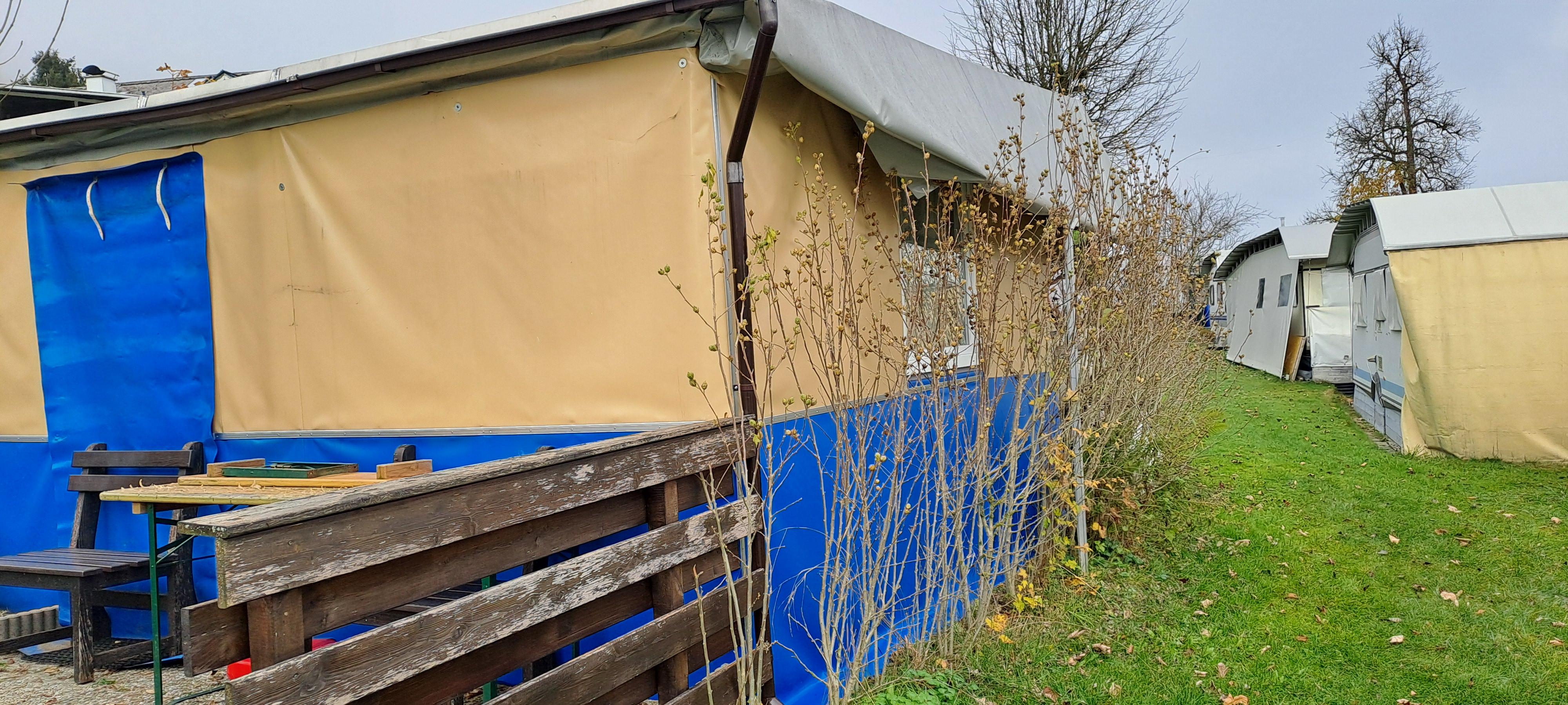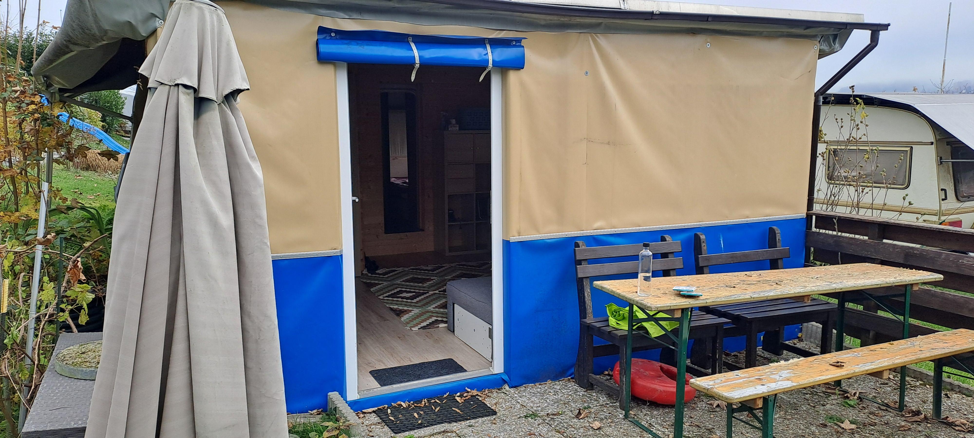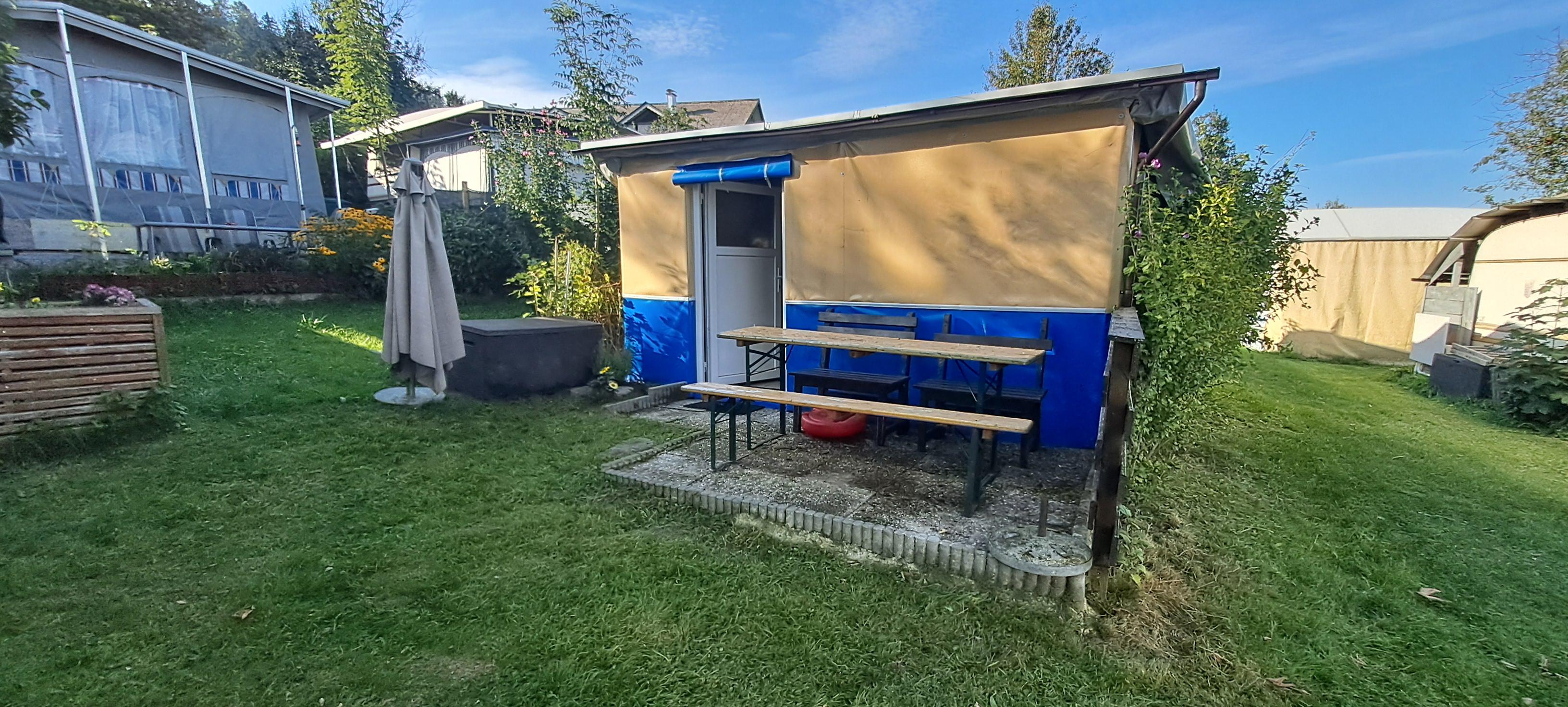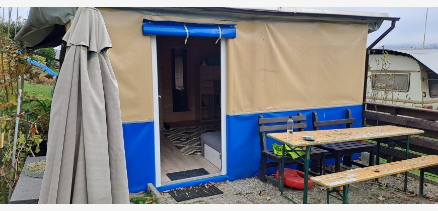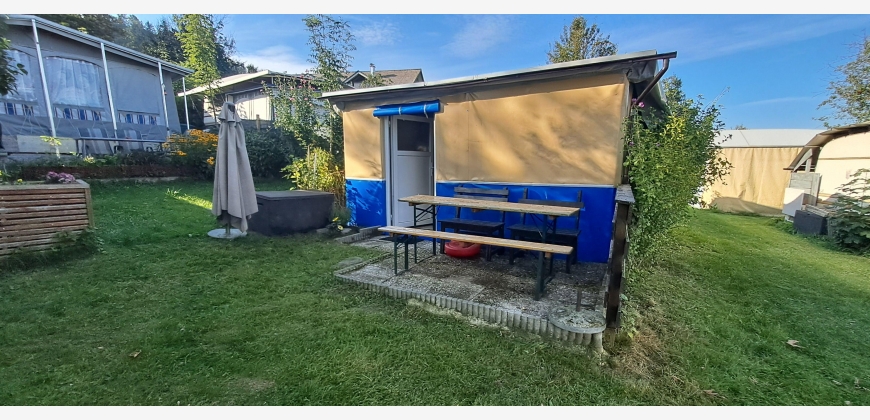 Verkauft wird dieser Wohnwagen inkl. ausgebautem Vorzelt. Der Wohnwagen selbst ist schon ein etwas älteres Semester, jedoch sehr gut erhalten, das Vorzelt wurde vor ein paar Jahren mit Holz verkleidet und mit einer neuen Küche ausgestattet. In der Ferienimmobile befindet sich fließendes (Warm)Wasser, Strom und eine Toilette. Auch ein Heizstrahler für kühlere Tage ist vorhanden. Der Wagen kann ganzjährig benutzt werden, das Duschhaus, welches sich gleich nebenan befindet, steht jedoch von Anfang April bis Ende Oktober zur Verfügung. Auch eine kleine Gartenfläche ist vorhanden.