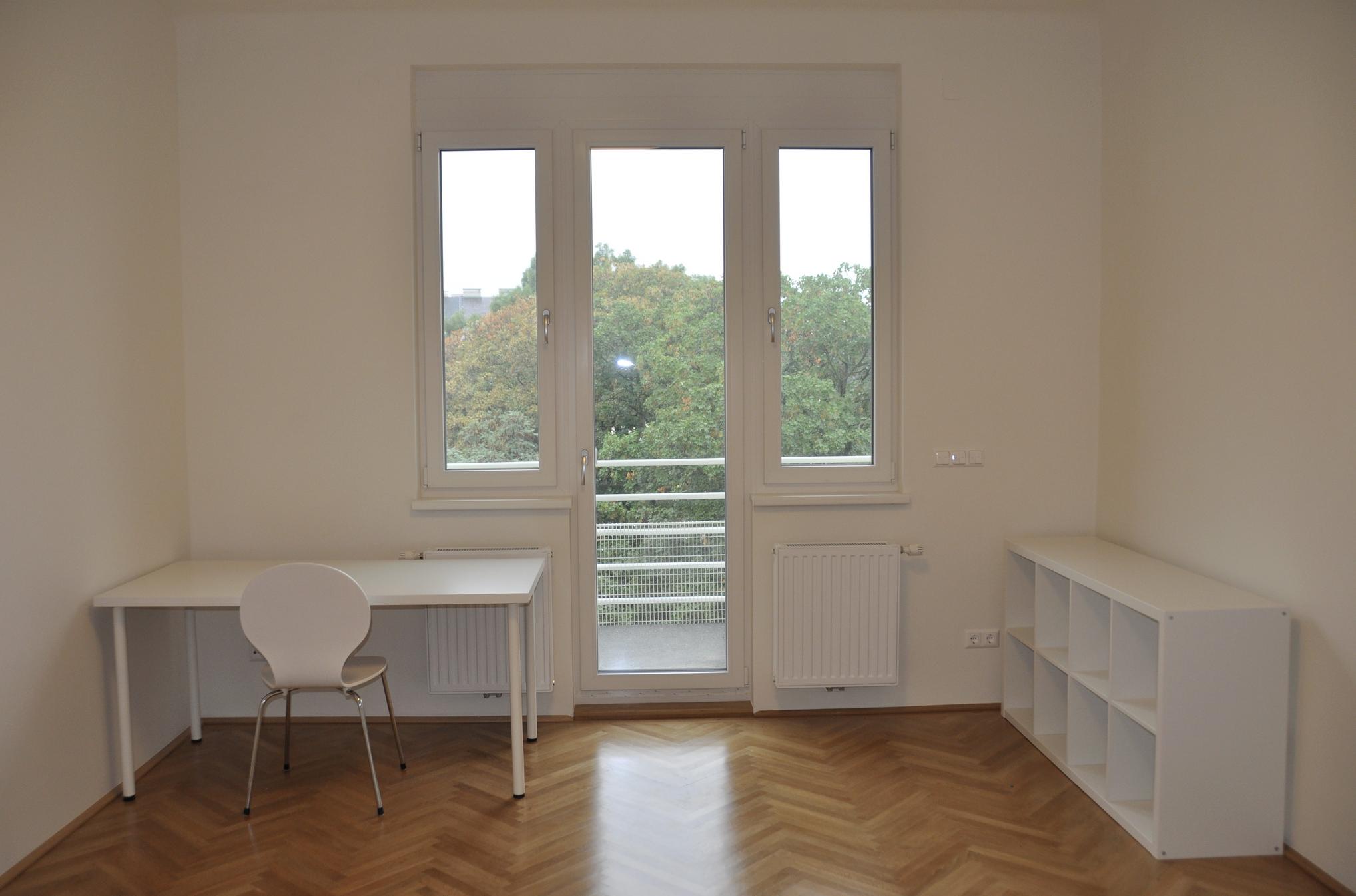20 m² großes, möbliertes Zimmer mit Balkon zum Park, westseitig, LAN-Anschluss, TV-Anschluss; alle Fenster mit Rollläden