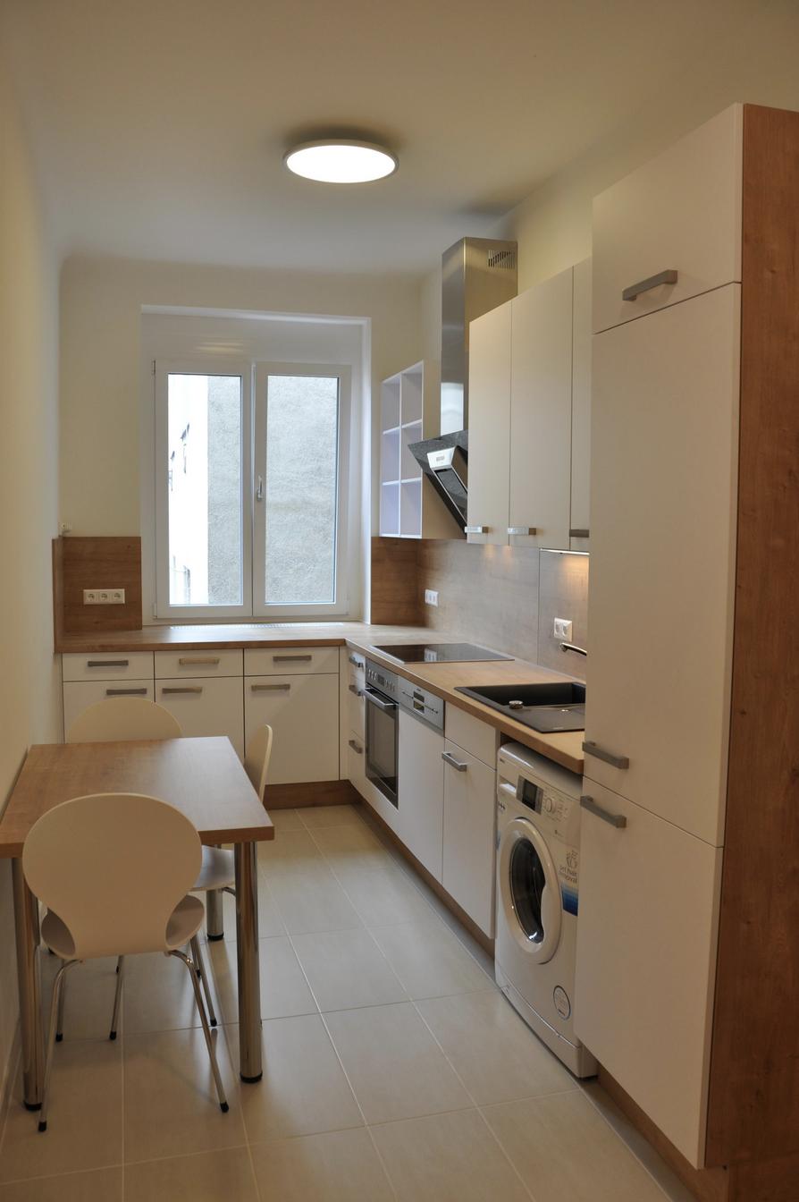 Küche mit neuer Einbauküche, Geräten, Kühl-Gefrierkombination, Waschmaschine und Esstisch
