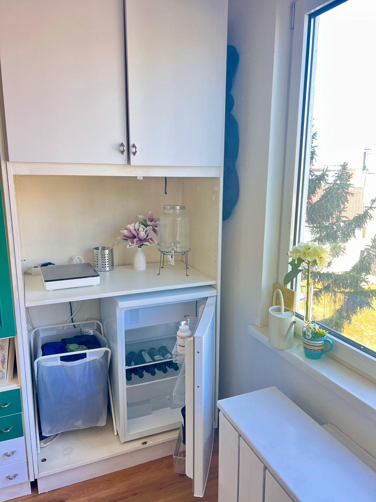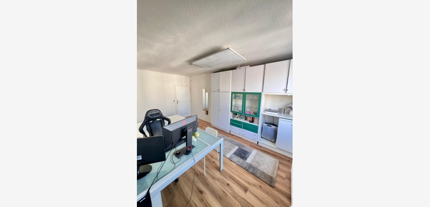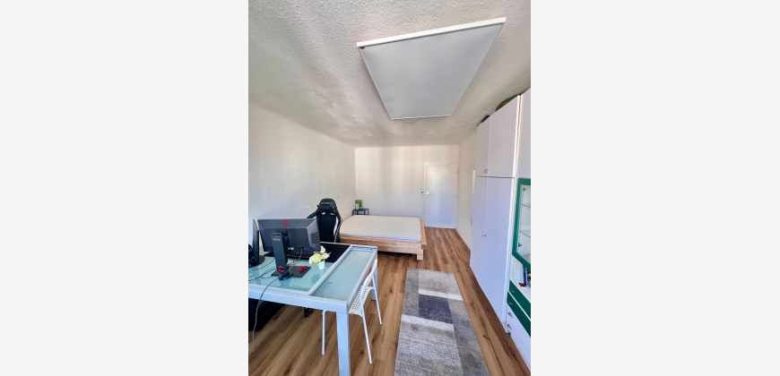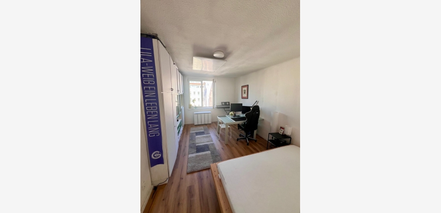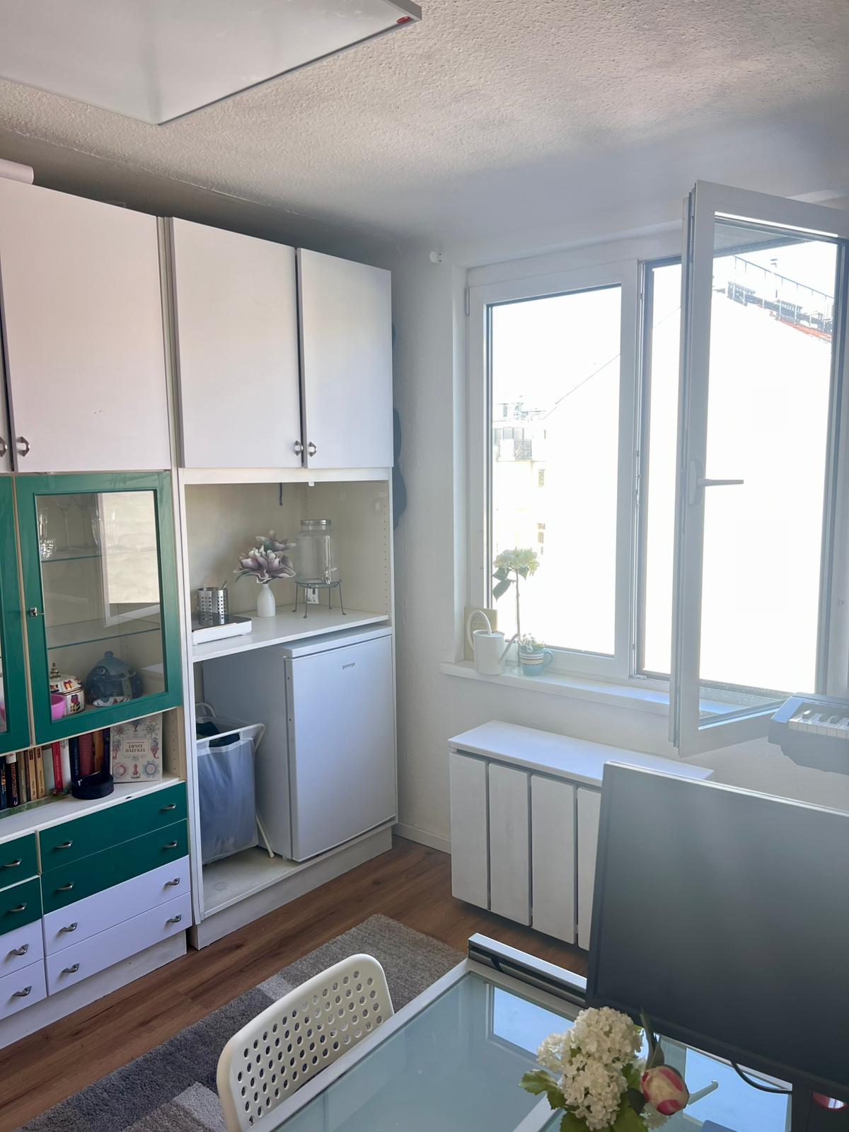 Das Zimmer ist vollständig möbliert und verfügt über einen eigenen Kitchenette-Bereich, ein Bett, einen Kleiderschrank sowie einen großen Tisch mit Sesseln.