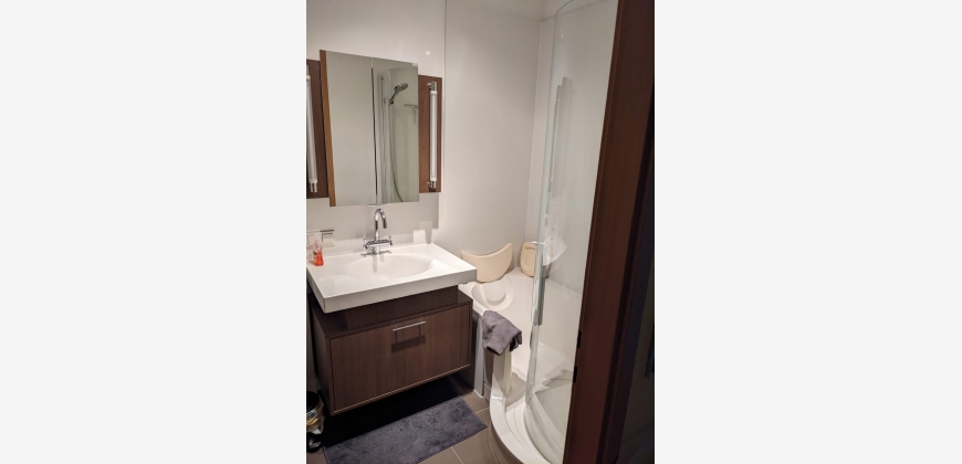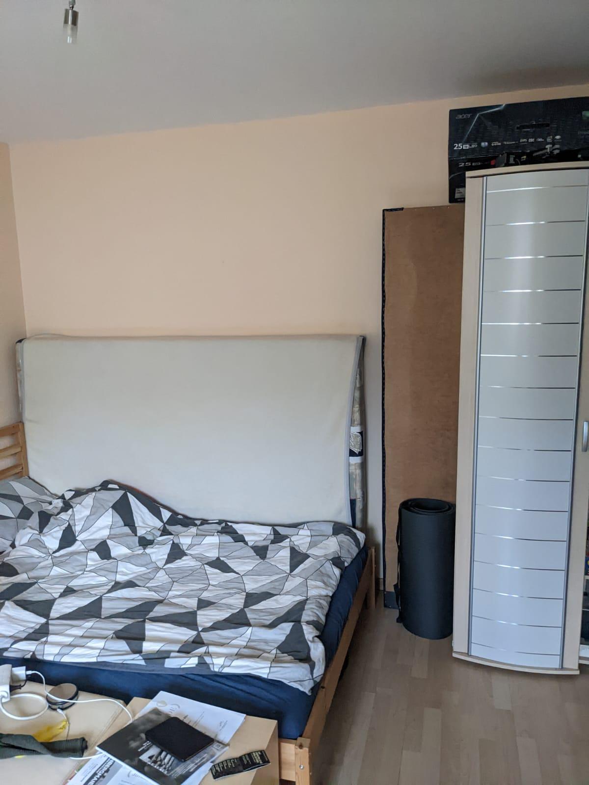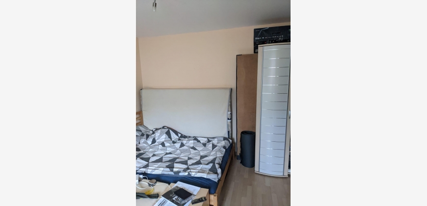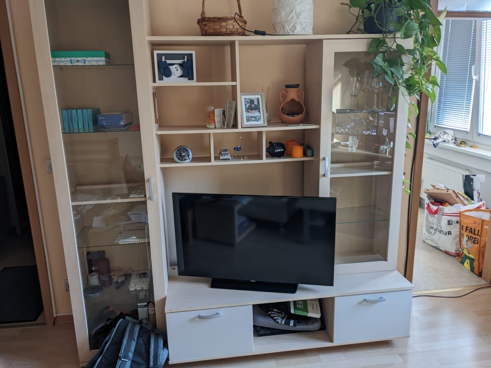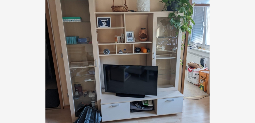 Wohn-/Schlafraum: Bett 160×200 cm mit Stauraum, Couch mit Couchtisch, Eckschreibtisch sowie Vitrine. Kabel-TV Anschlüsse vorhanden.