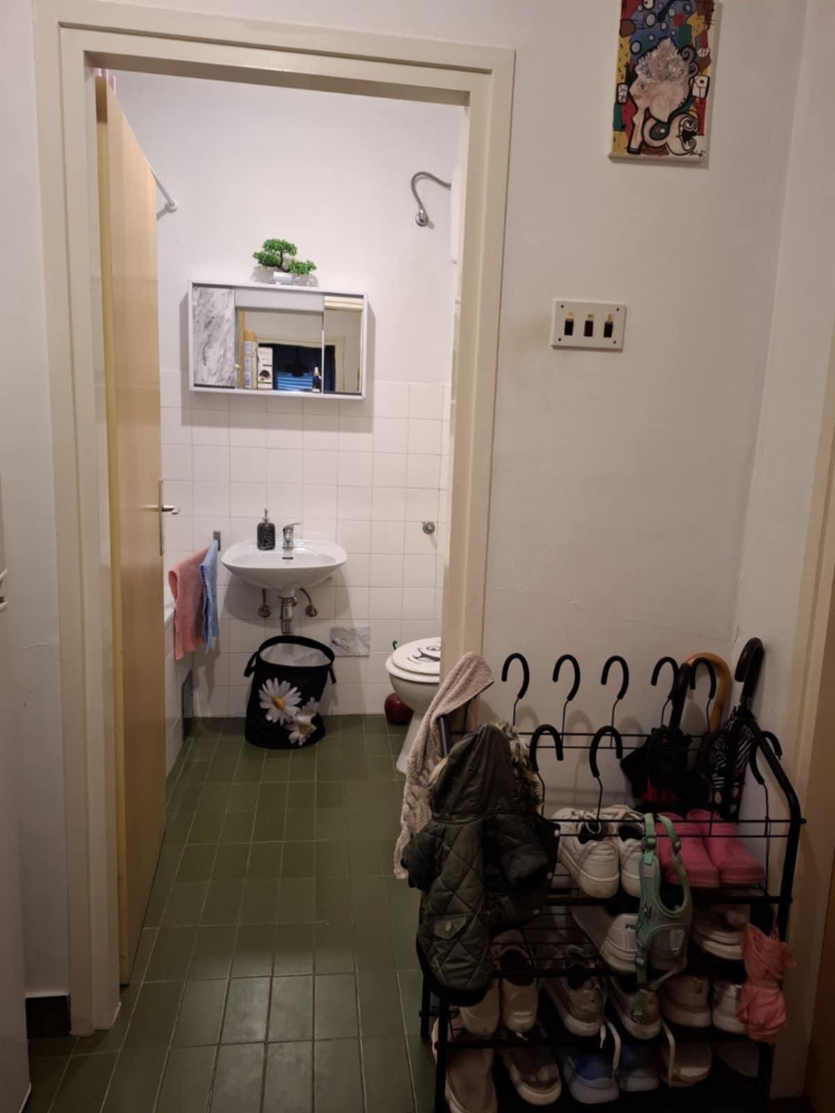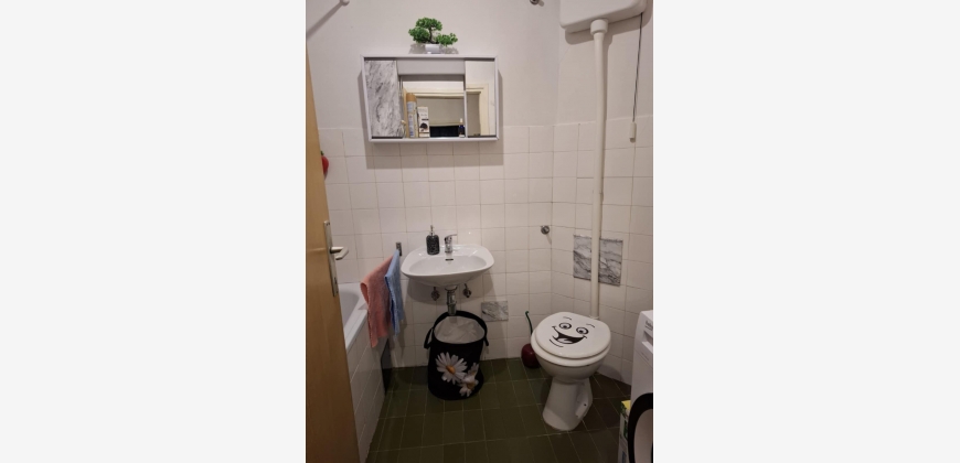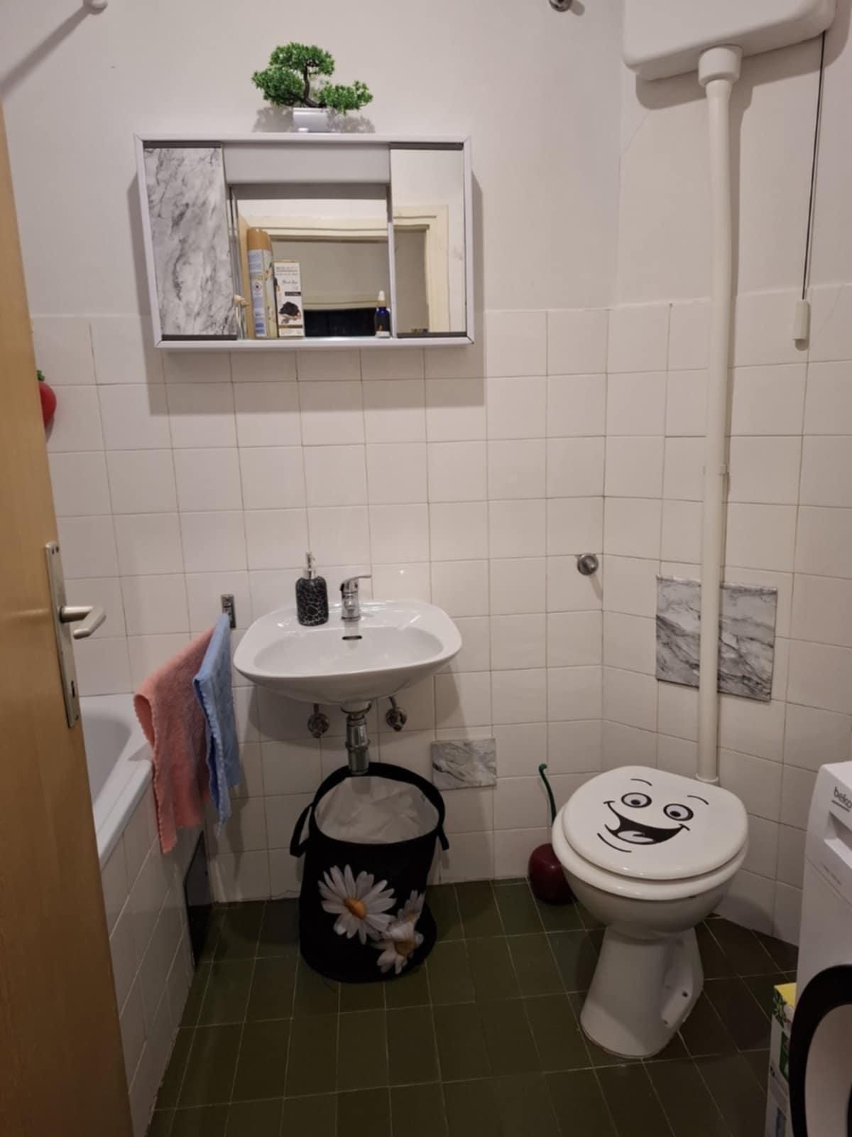 Ein Badezimmer mit Badewanne, WC und Waschmaschine