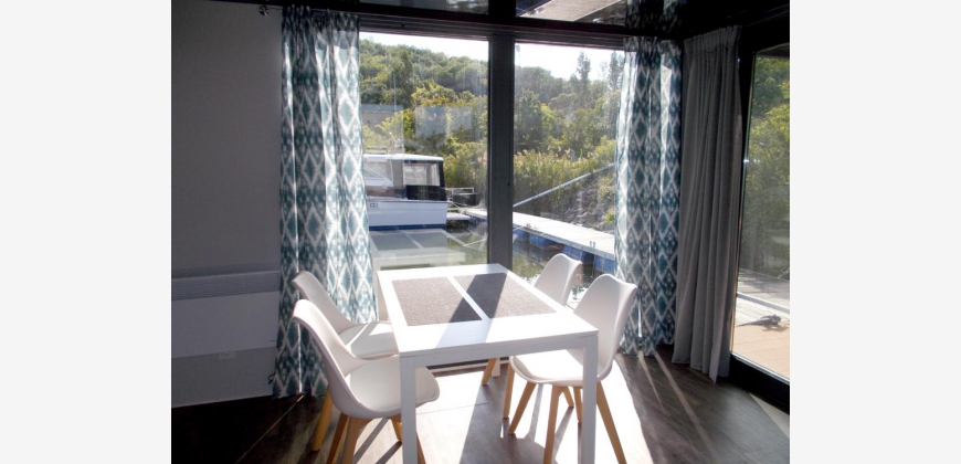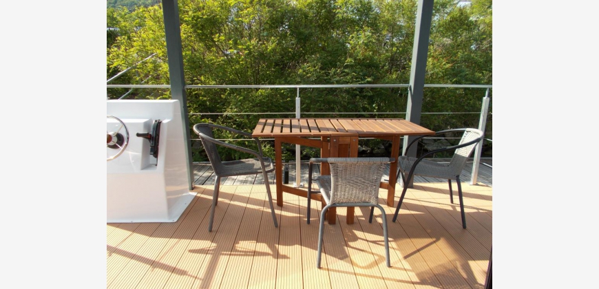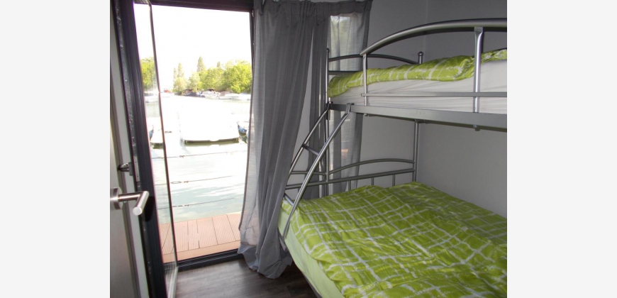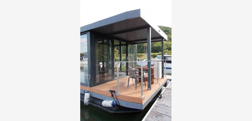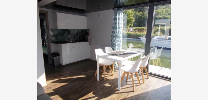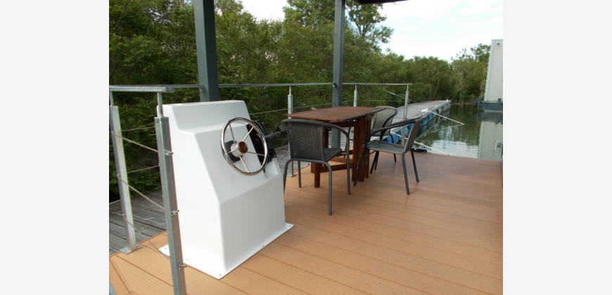 Das modern gestaltete Hausboot (Baujahr 2018) verfügt über einen großen Wohnbereich (2 Schlafplätze), welcher das Wohnzimmer, Esszimmer und die Küche vereint, ein separates Schlafzimmer (3 Schlafplätze), ein Badezimmer mit WC und zwei Terrassen.