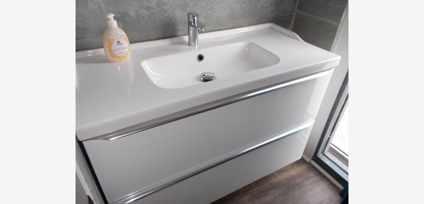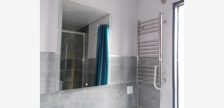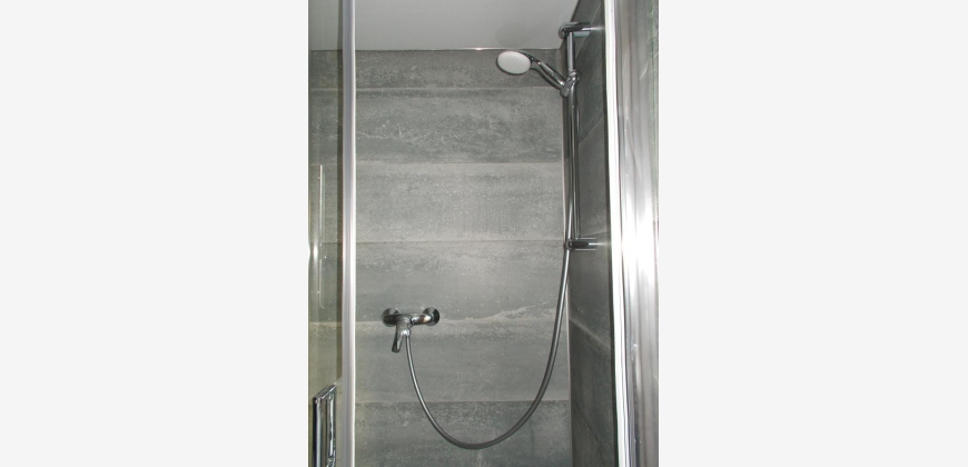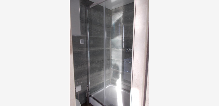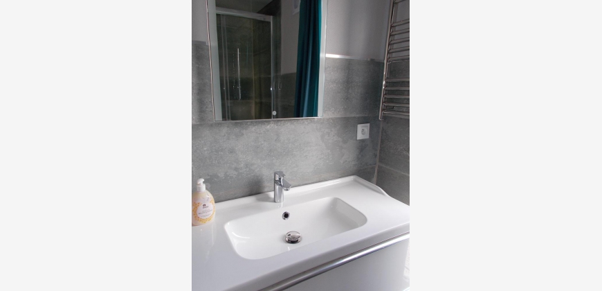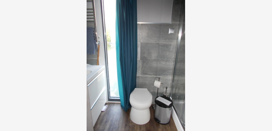 Das elegante Badezimmer verfügt über eine Duschkabine und ein Waschbecken mit einem beleuchteten Spiegel. Ebenfalls im Badezimmer befindet sich das WC.