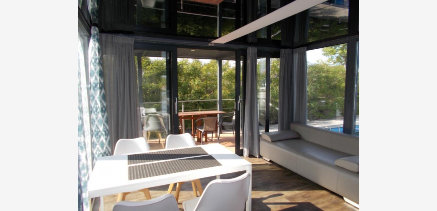 LED-Beleuchtung mit versenkten Spots ist für Ihren Komfort vorhanden, die großen Glasflächen sind 3-fach verglast.