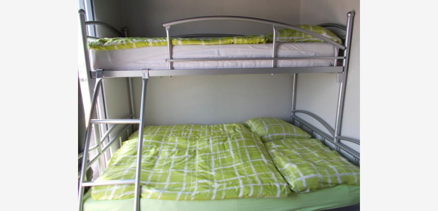 Im Schlafzimmer finden 3 Personen einen Schlafplatz – in einem Stockbett, welches aus einem Doppelbett (unten) und einem Einzelbett (oben) besteht.
