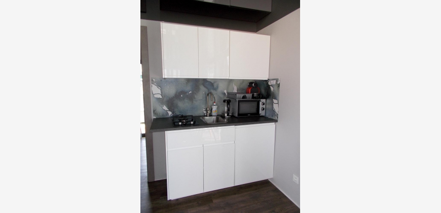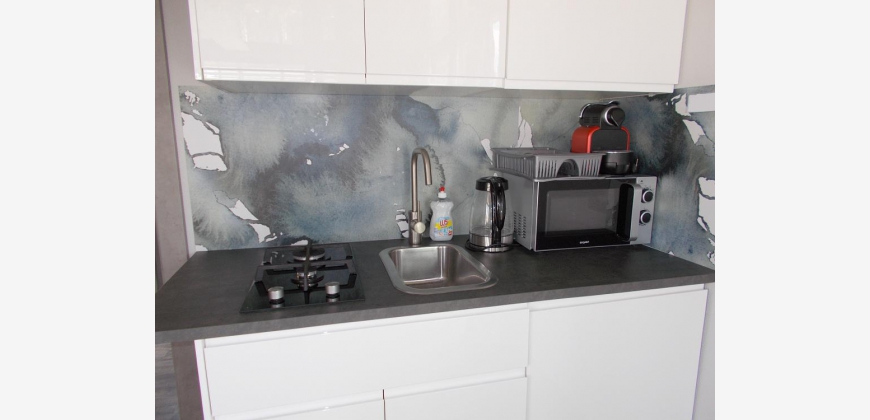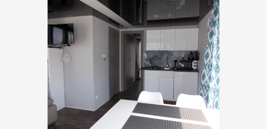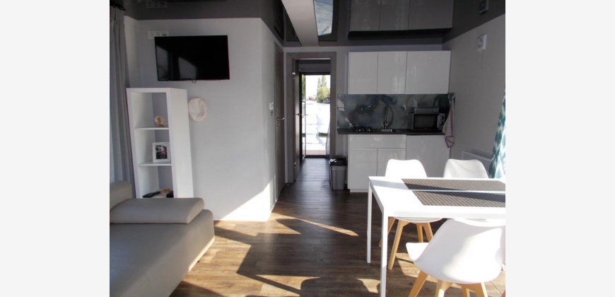 In dem Wohnbereich finden Sie ein Sofa, das man in ein Doppelbett umwandeln kann, einen Fernseher und einen Esstisch mit 4 Stühlen. Die kleine, aber feine Küche verfügt über eine Spüle, einen Gasherd mit zwei Kochfeldern, einen Kühlschrank und einen Wasserkocher.