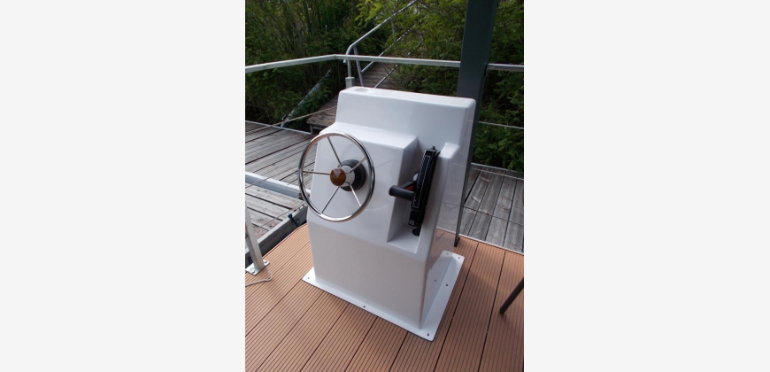 Das Hausboot hat zwei große Schwimmer/Tanks aus Kunststoff. In einem der Schwimmer befindet der Tank für sauberes Wasser, in dem anderen der Tank für das Abwasser. Beide Tanks haben ein Volumen von je 1000 Liter.