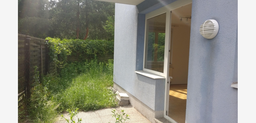 Ein großer uneinsichtiger Garten führt rund um das Haus mit Ausblick auf die Bäume.