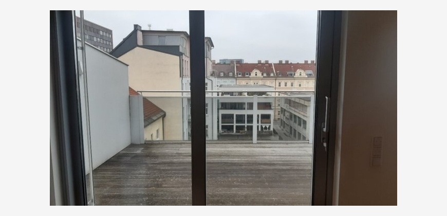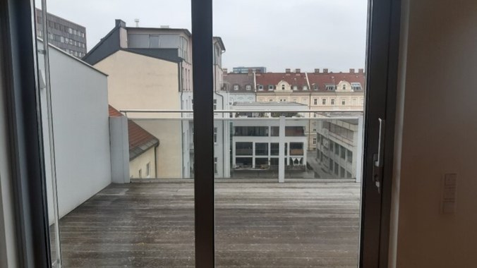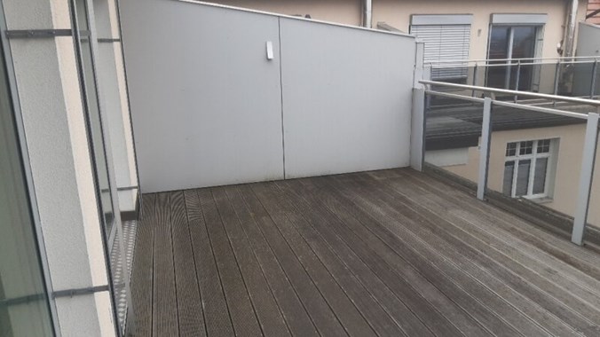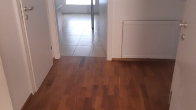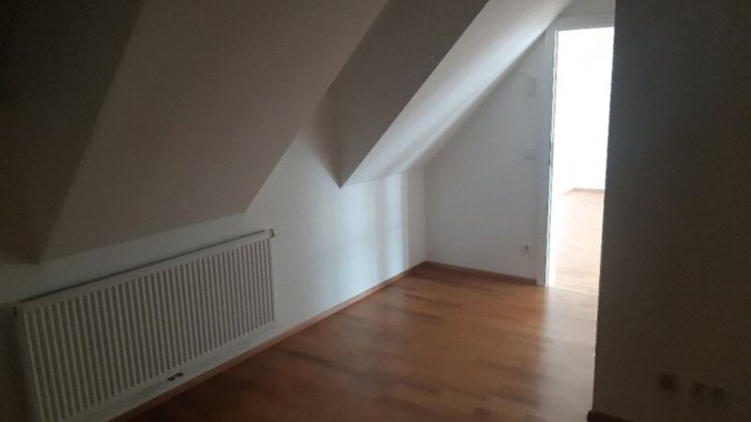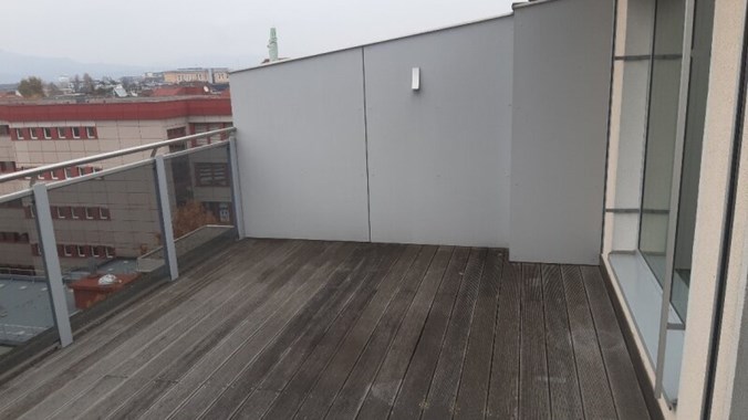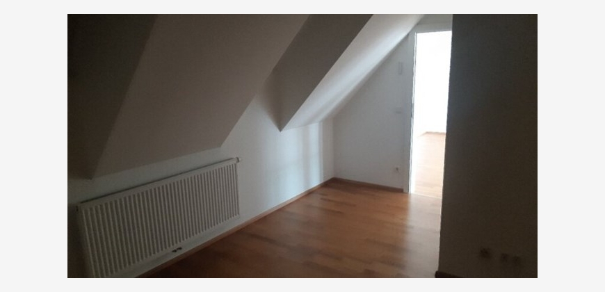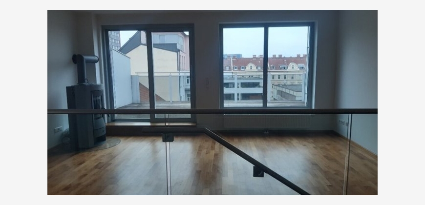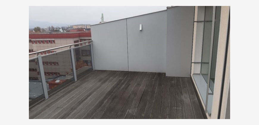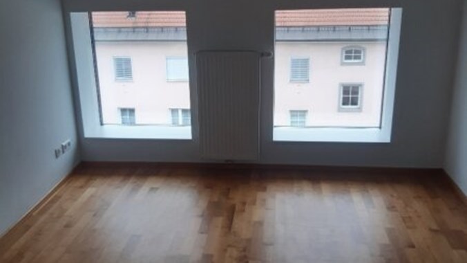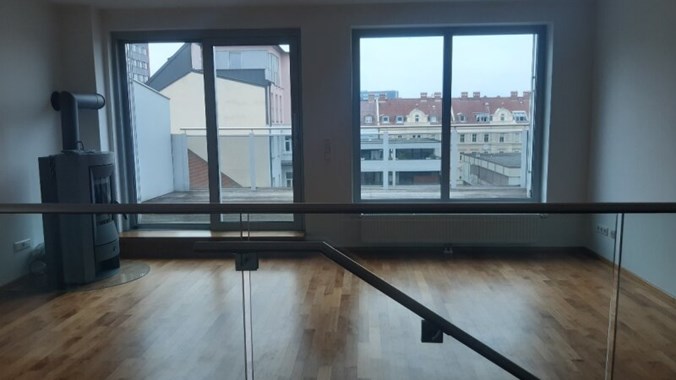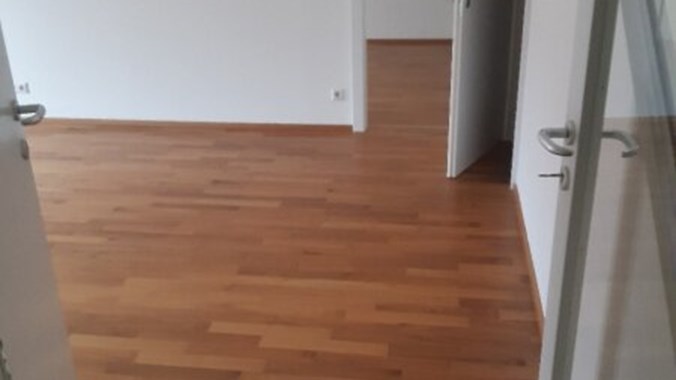 Stilwohnung mit Wohnküche, 3 Schlafzimmern und Parkettboden, 94 m², Dachterrasse, Abstellkammer und Waschraum. Zimmer straßenseitig. Einbauküche mit Kühlschrank, E-Herd und Mikrowelle. Bad mit Wanne, zwei WCs, Fernwärmezentralheizung, Lift. Unbefristet.
