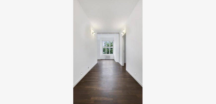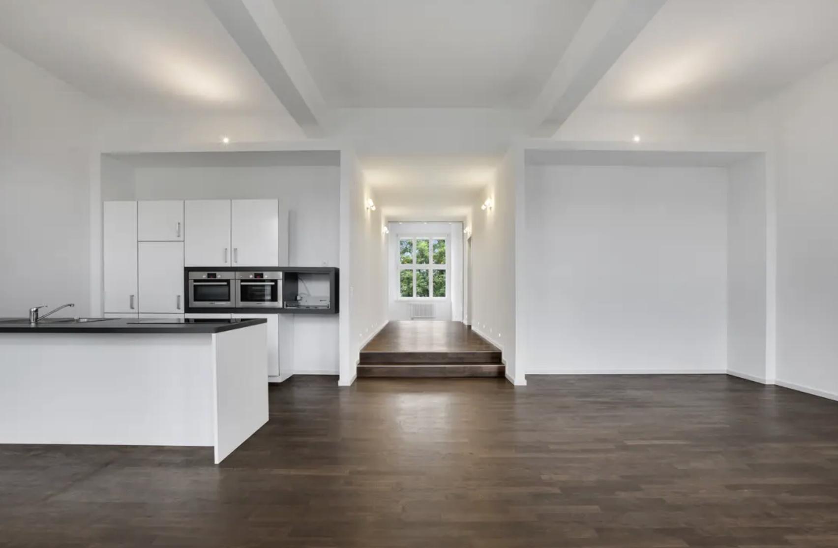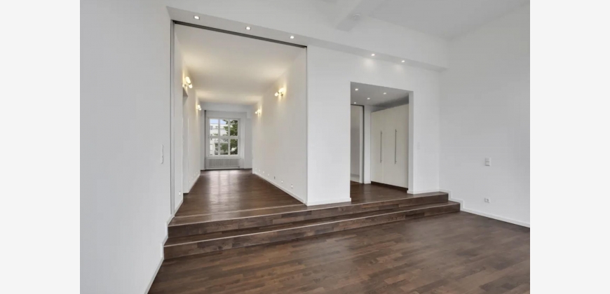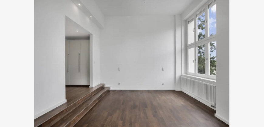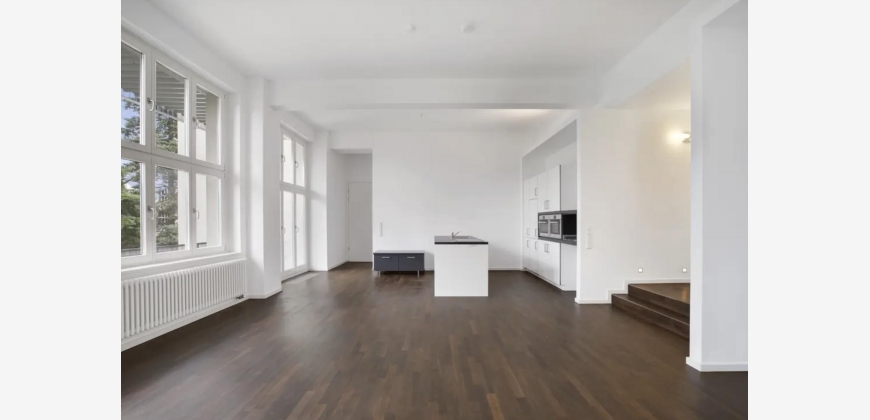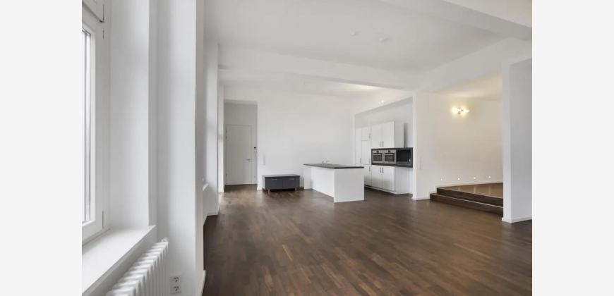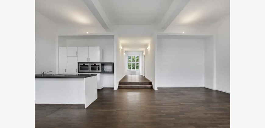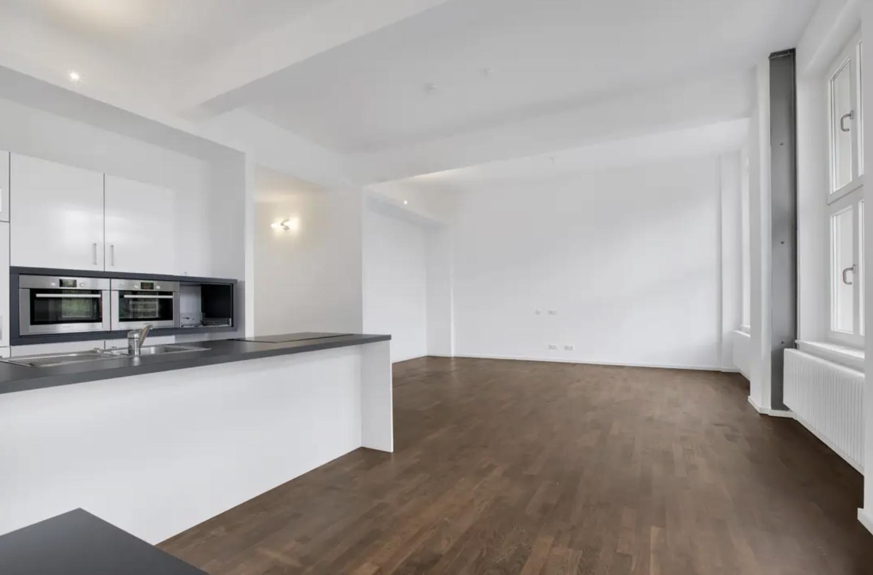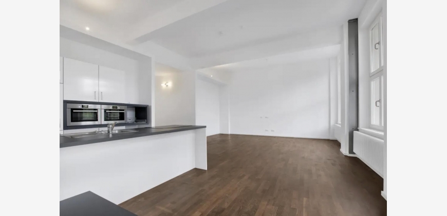 Vom Entree der Wohnung gelangen Sie direkt in den großzügigen Wohn- und Essbereich, in dem bereits eine hochwertige Einbauküche mit Markengeräten und Kochinsel integriert ist. Der rund 45 qm große Raum ist durch eine große Fensterfront lichtdurchflutet. Eines der bodentiefen Fensterelemente führt auf den ca. 9,50 qm großen Balkon, der zum ruhigen Innenhof ausgerichtet ist.