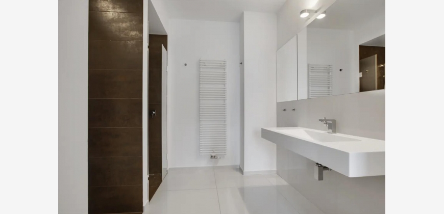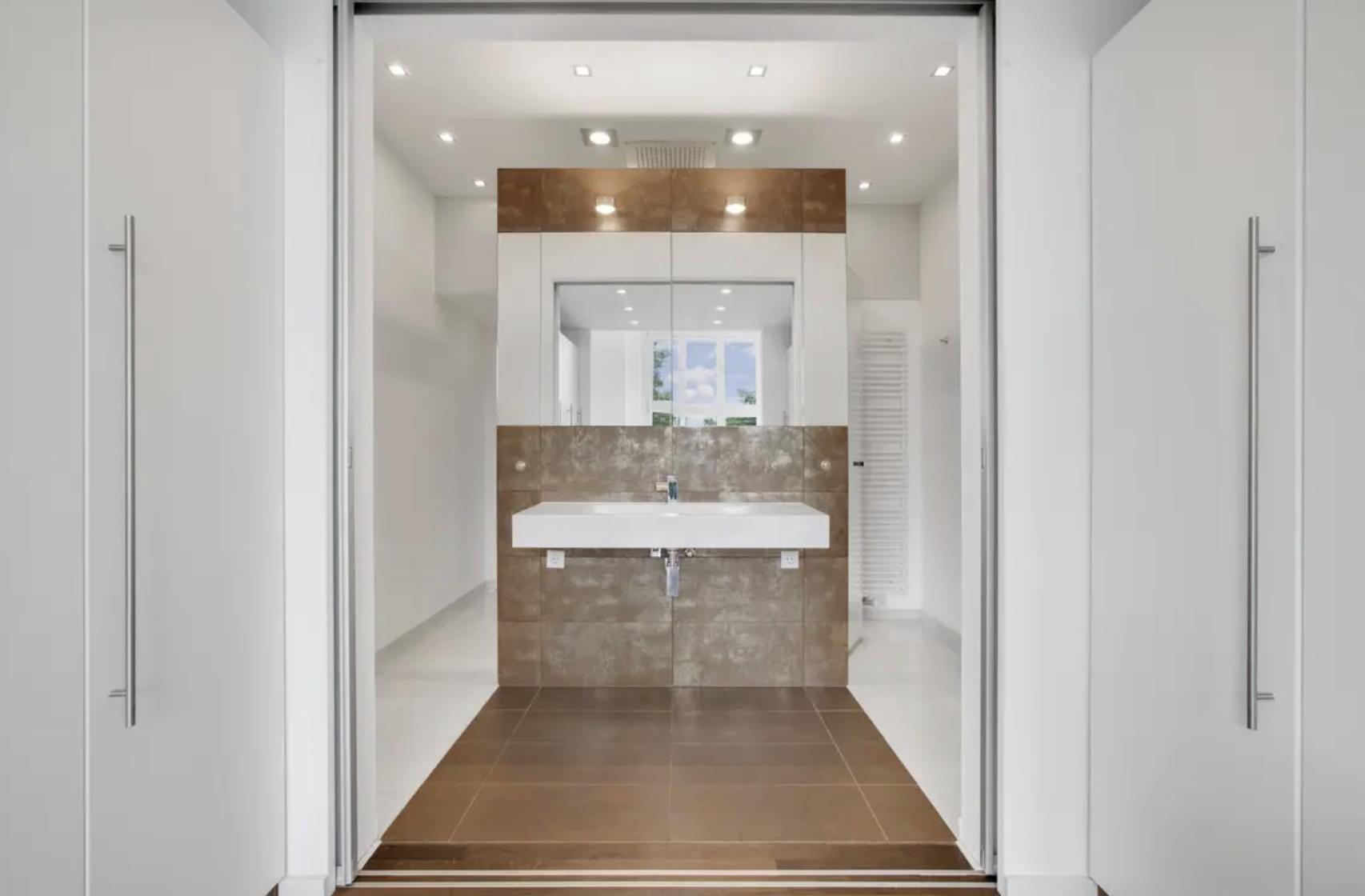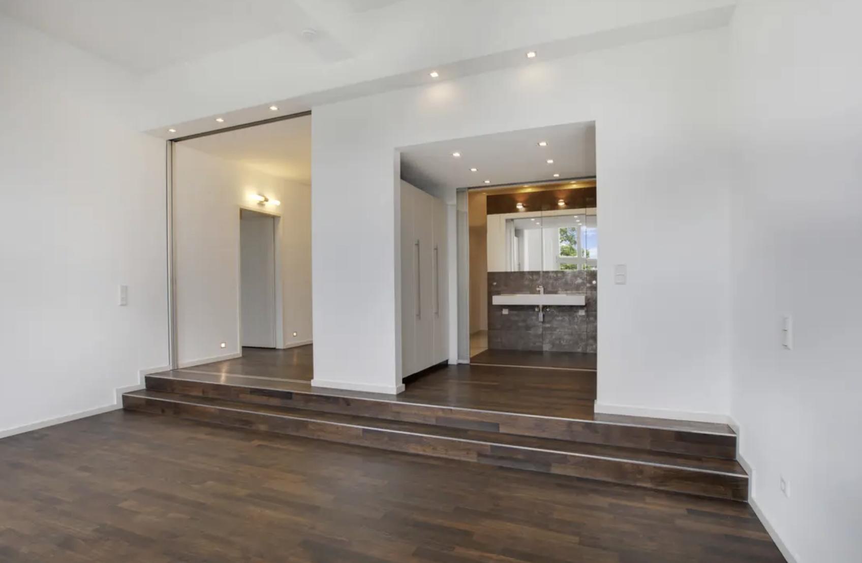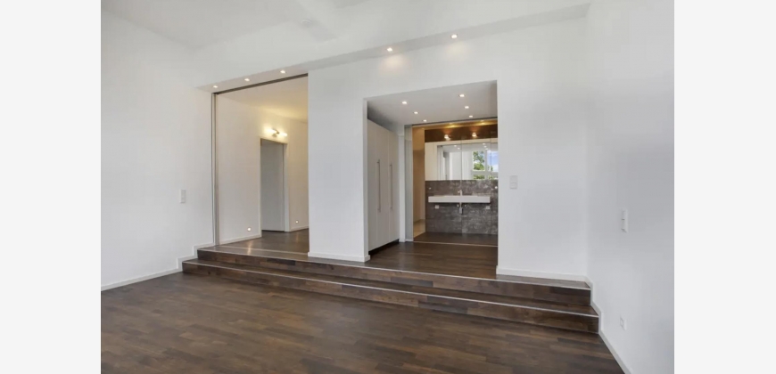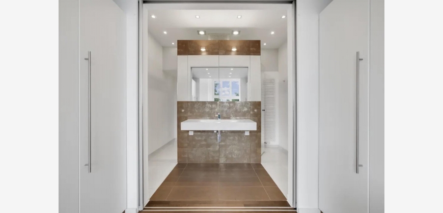 Ein breiter Flur mit direkter und indirekter Beleuchtung verbindet den Wohnbereich mit den Schlafzimmern. Das größere Schlafzimmer ist offen gestaltet und lässt sich durch isolierte Schiebetüren vom Wohnbereich abtrennen. Über einen begehbaren Kleiderschrank erreichen Sie das erste Bad, ausgestattet mit Rain-Shower-Dusche, WC und Waschbecken.