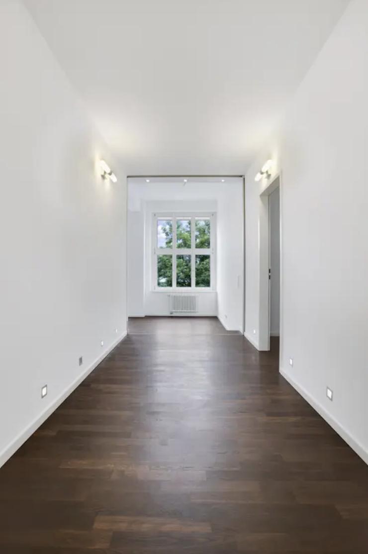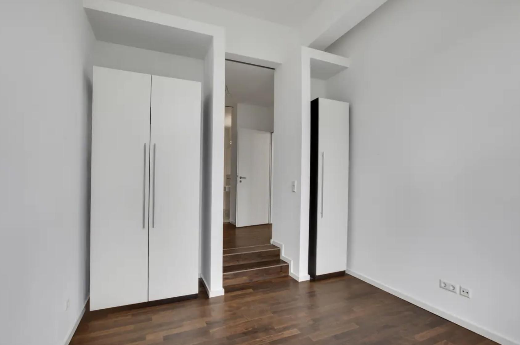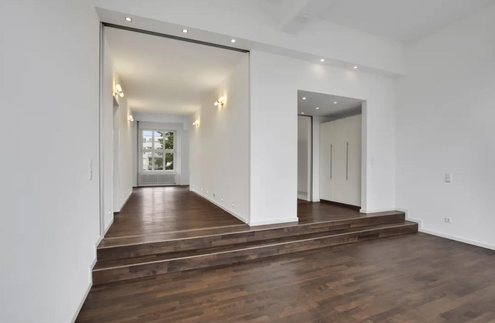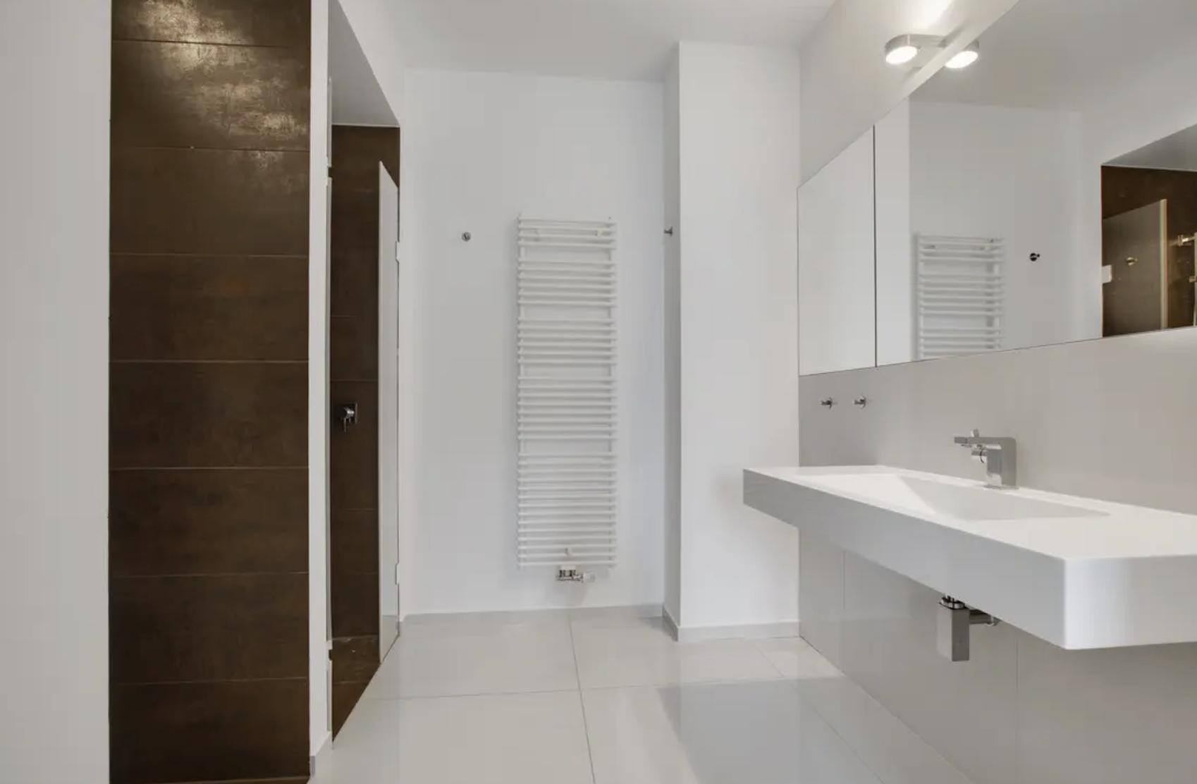 Ein breiter Flur mit direkter und indirekter Beleuchtung verbindet den Wohnbereich mit den Schlafzimmern. Das größere Schlafzimmer ist offen gestaltet und lässt sich durch isolierte Schiebetüren vom Wohnbereich abtrennen. Über einen begehbaren Kleiderschrank erreichen Sie das erste Bad, ausgestattet mit Rain-Shower-Dusche, WC und Waschbecken.