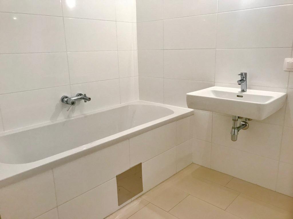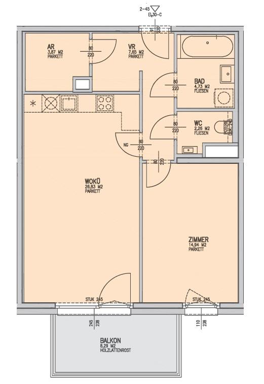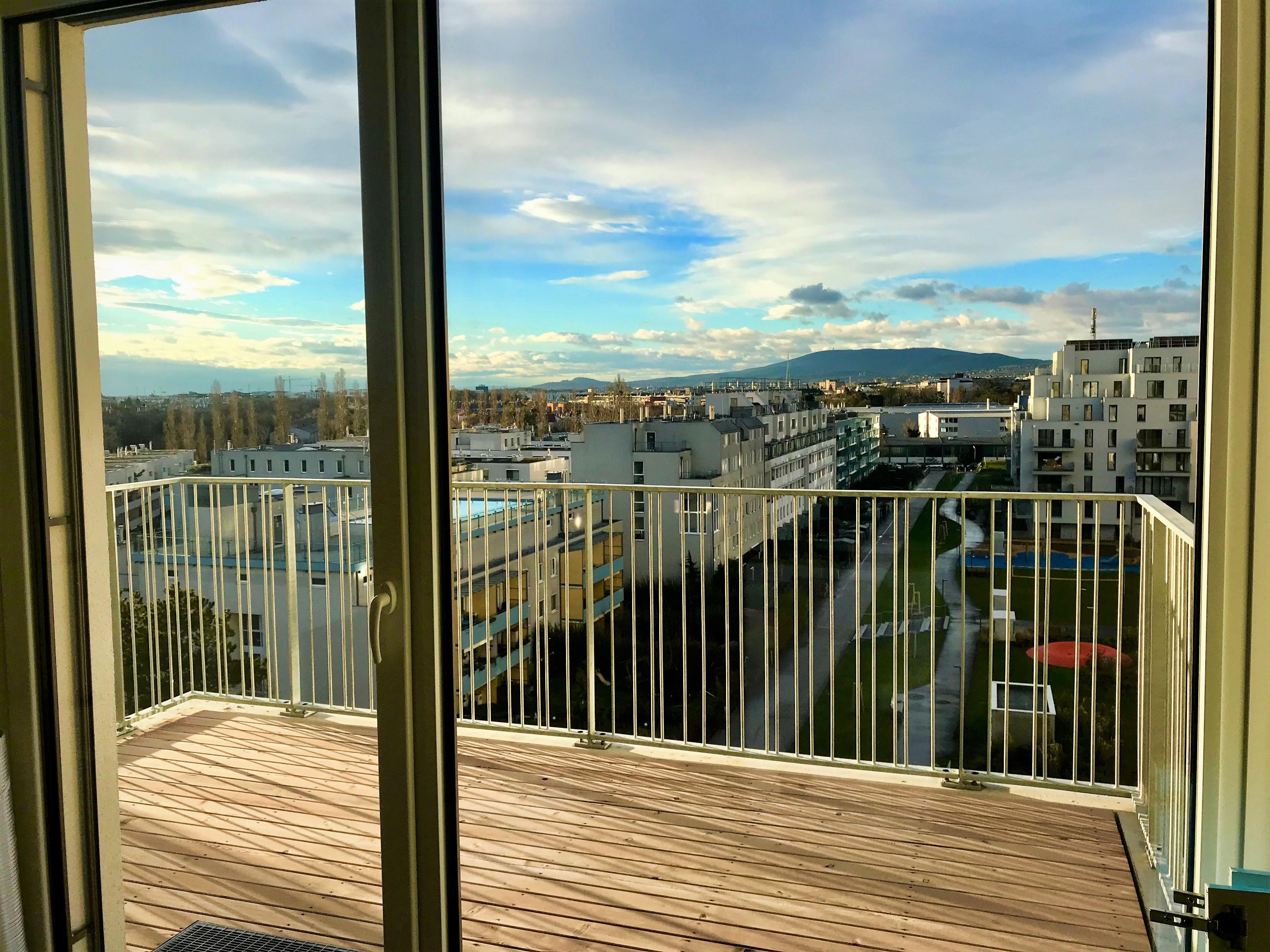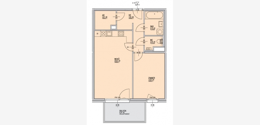 Wohnküche 26,83 m2, Schlafzimmer 14,94 m2, Bad m. Badewanne, WC separat, Abstellraum, Vorraum, Balkon 8,29 m2 mit unverbaubarem Fernblick zum Wienerwald (Panoramablick Ost-Süd-West).