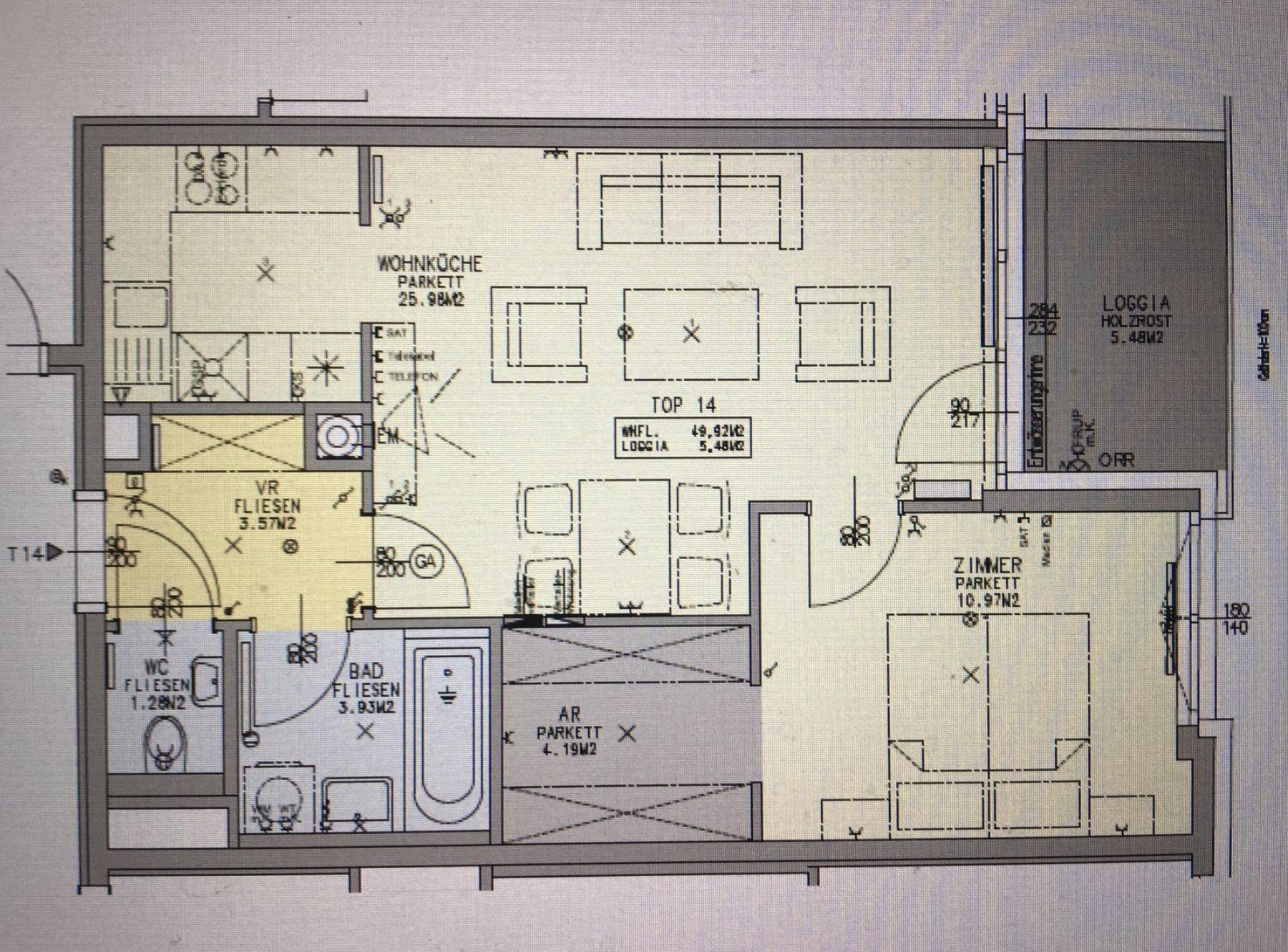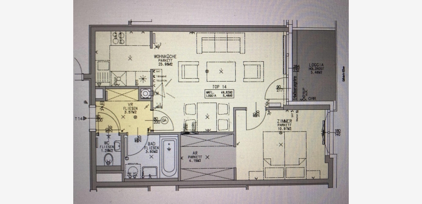 55 m2, moderne offene Architektur, Wohnkueche, Schlafraum, Vorzimmer, Bad & WC getrennt, Loggia & Balkon, sehr gute Infrastruktur, 2. Stock mit Lift, Gehobene Ausstattung, Neue Dan Kueche inklusive E-Geraete. Begehbarer Schrank, Abstellkammer, Garagenplatz extra im Haus zumietbar, exzellenter Zustand.