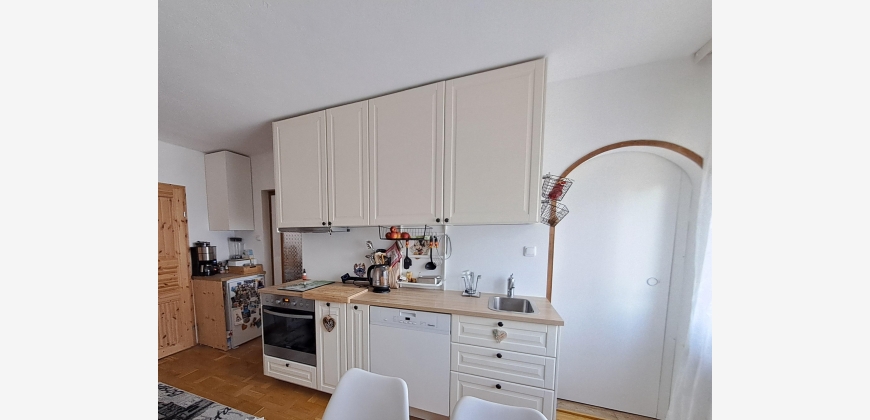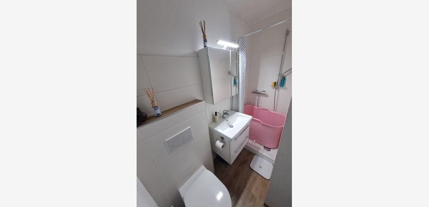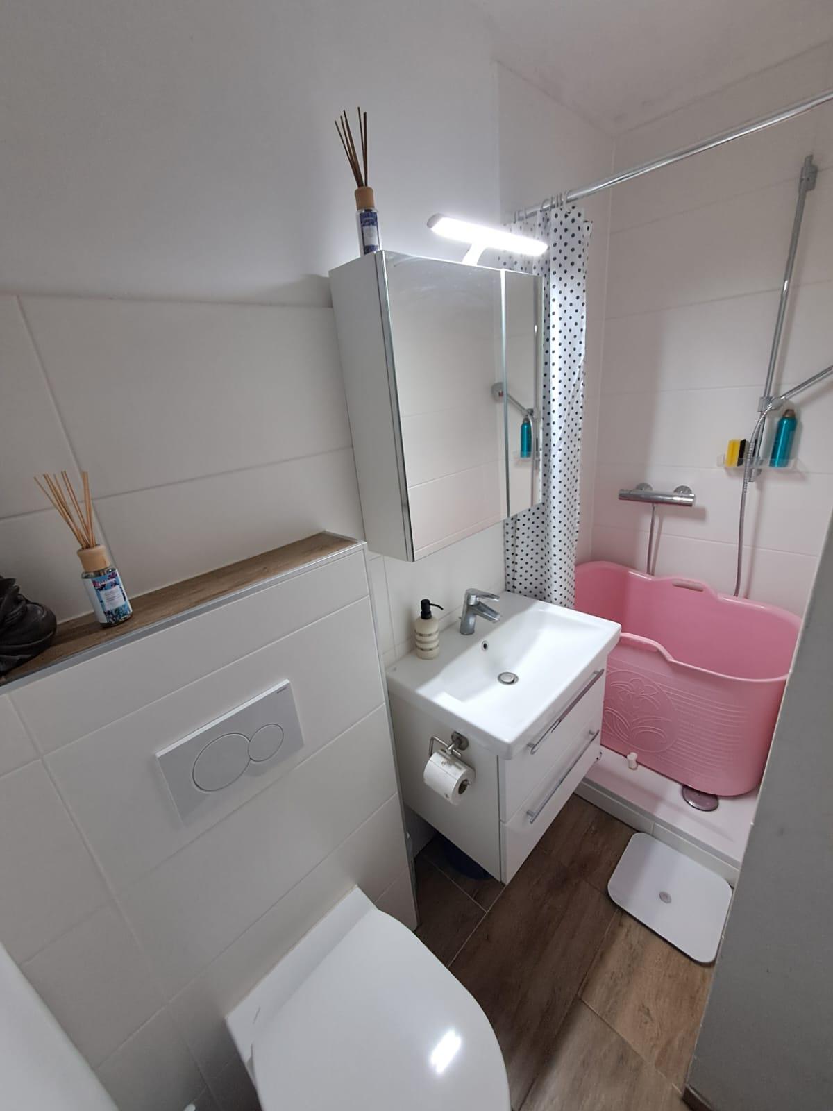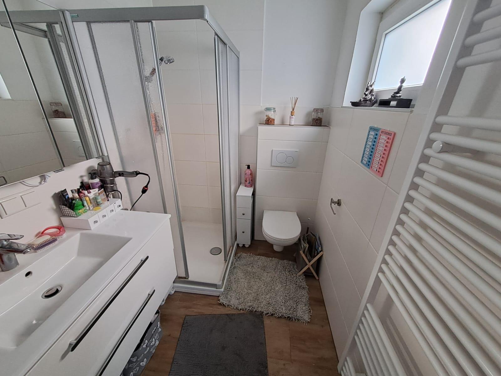 EG: kleiner Eingangsbereich, Garderobe, Gästebad mit Dusche und WC, Küche mit Essbereich, 1 Schlafzimmer/Wohnzimmer, Bad mit Dusche und WC.