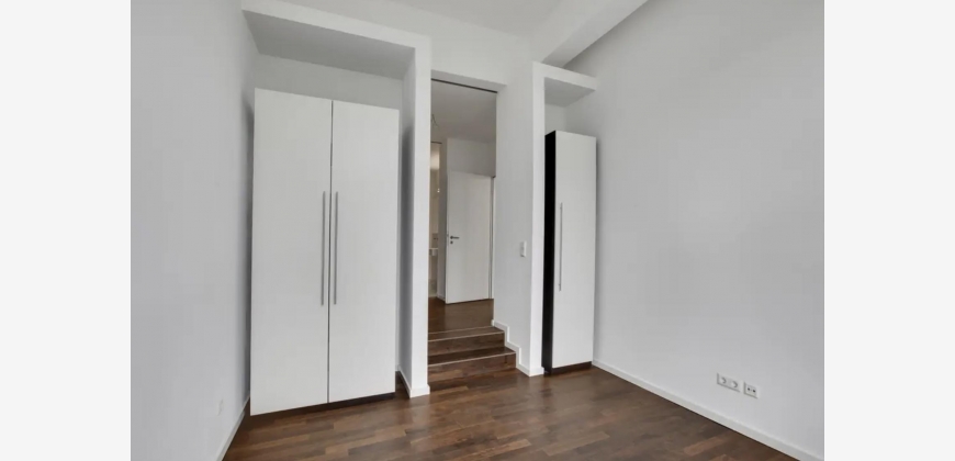 Ein breiter Flur mit direkter und indirekter Beleuchtung verbindet den Wohnbereich mit den Schlafzimmern. Das größere Schlafzimmer ist offen gestaltet und lässt sich durch isolierte Schiebetüren vom Wohnbereich abtrennen. Über einen begehbaren Kleiderschrank erreichen Sie das erste Bad, ausgestattet mit Rain-Shower-Dusche, WC und Waschbecken.