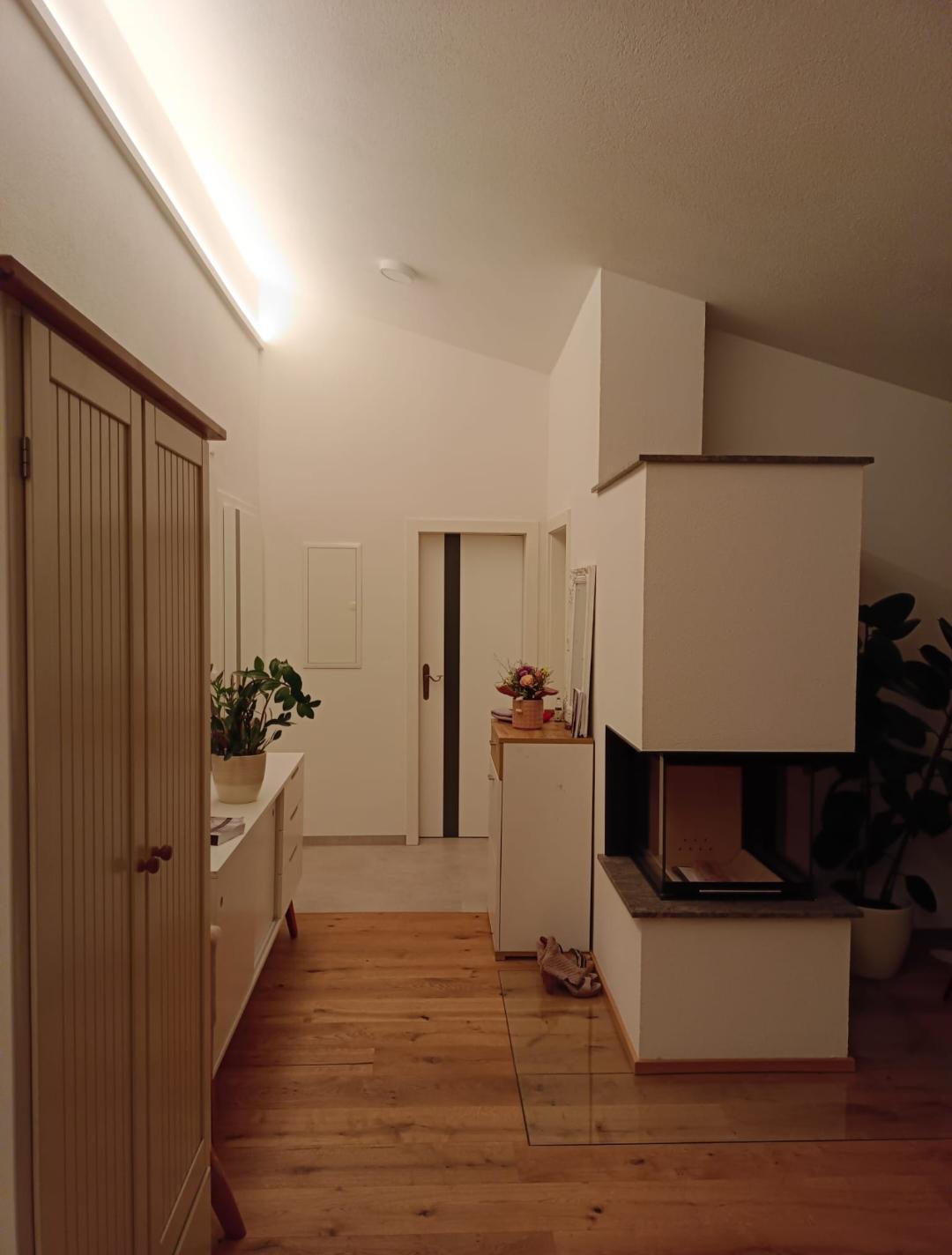 Moderner, verglaster Kamin, offen oder geschlossen nutzbar, fungiert zugleich als stilvoller Raumteiler