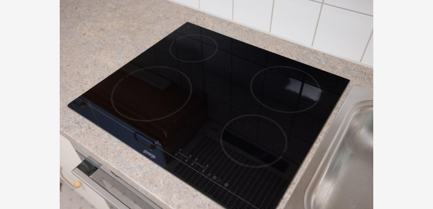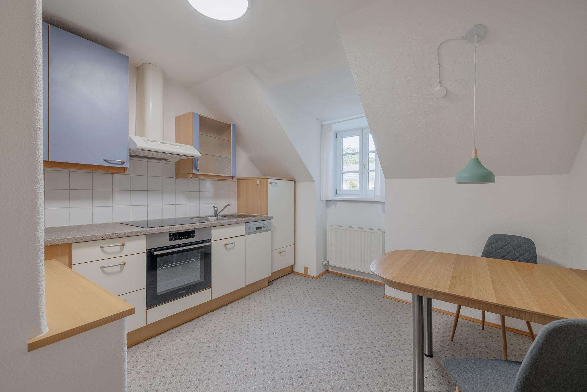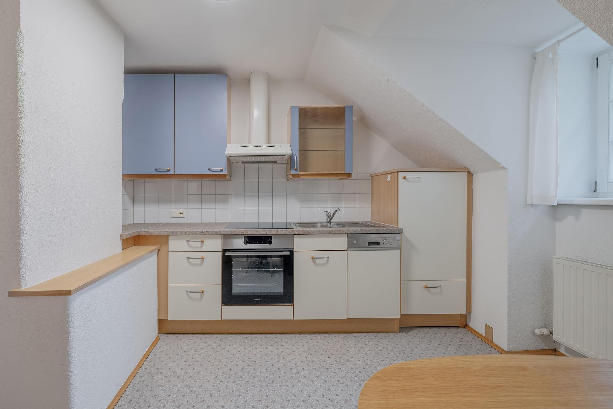 Der großzügige Wohn- und Schlafbereich ist mit neuem Eichenholzparkett ausgestattet und bietet viel Platz für individuelle Wohnideen. Die Einbauküche ist zwar nicht neu, überzeugt aber durch ihren charmanten Stil sowie neue Geräte: ein Geschirrspüler, ein neuer Herd und eine neue Arbeitsfläche sorgen für modernen Komfort.