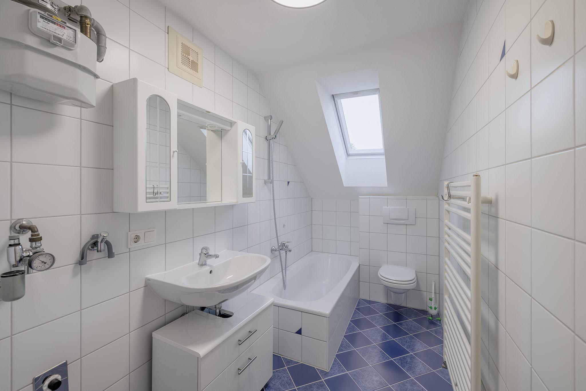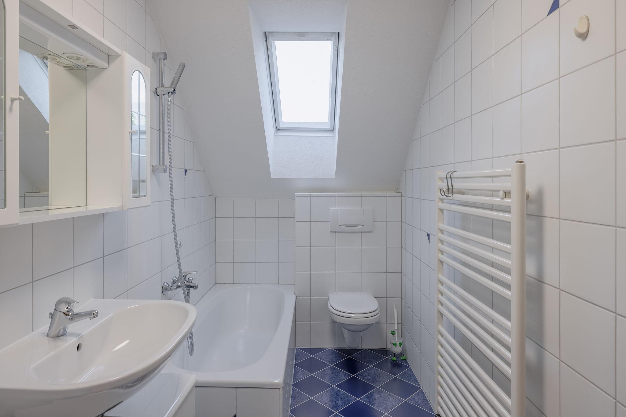Das Badezimmer mit Fenster ist hell und freundlich gestaltet.