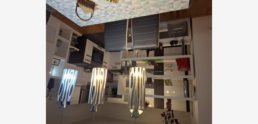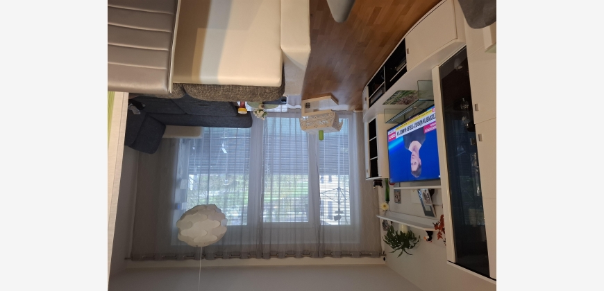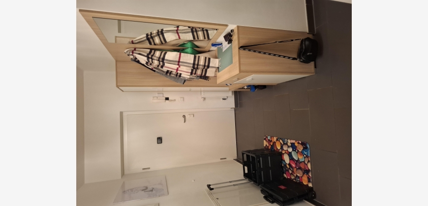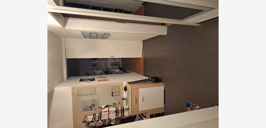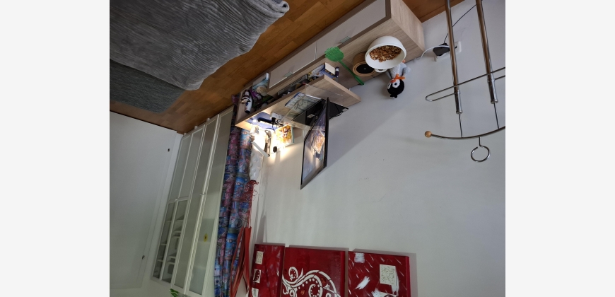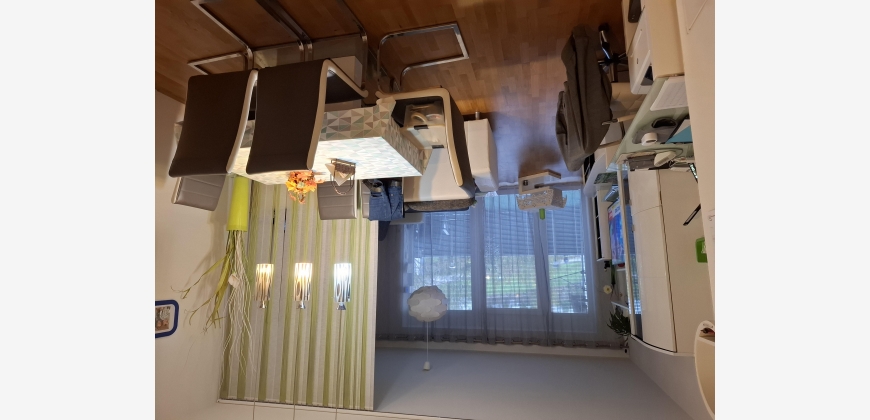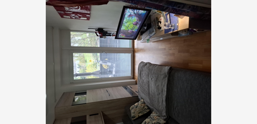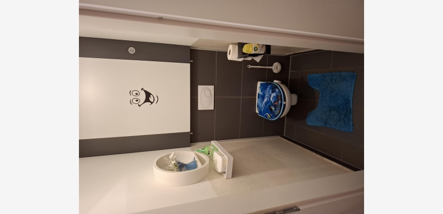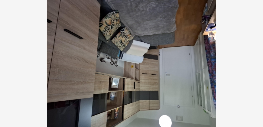 Geradeaus befindet sich das Kinderzimmer, in hellbraun gehalten, mit einer dunkelgrauen ausziehbaren Couch, von wo man auf den Balkon sowie auch vom Wohnzimmer und Schlafzimmer kommt.