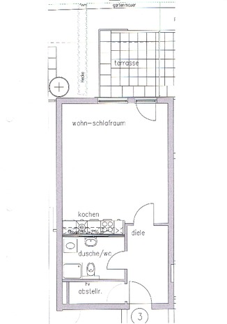 Diele, Abstellraum, Dusche/WC, Wohnschlafraum mit Kochnische.