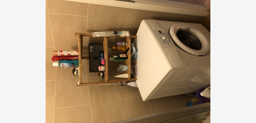 Badezimmer: Waschmaschine, Waschbeckenschrank, Holz-Eckregal, Duschregal
