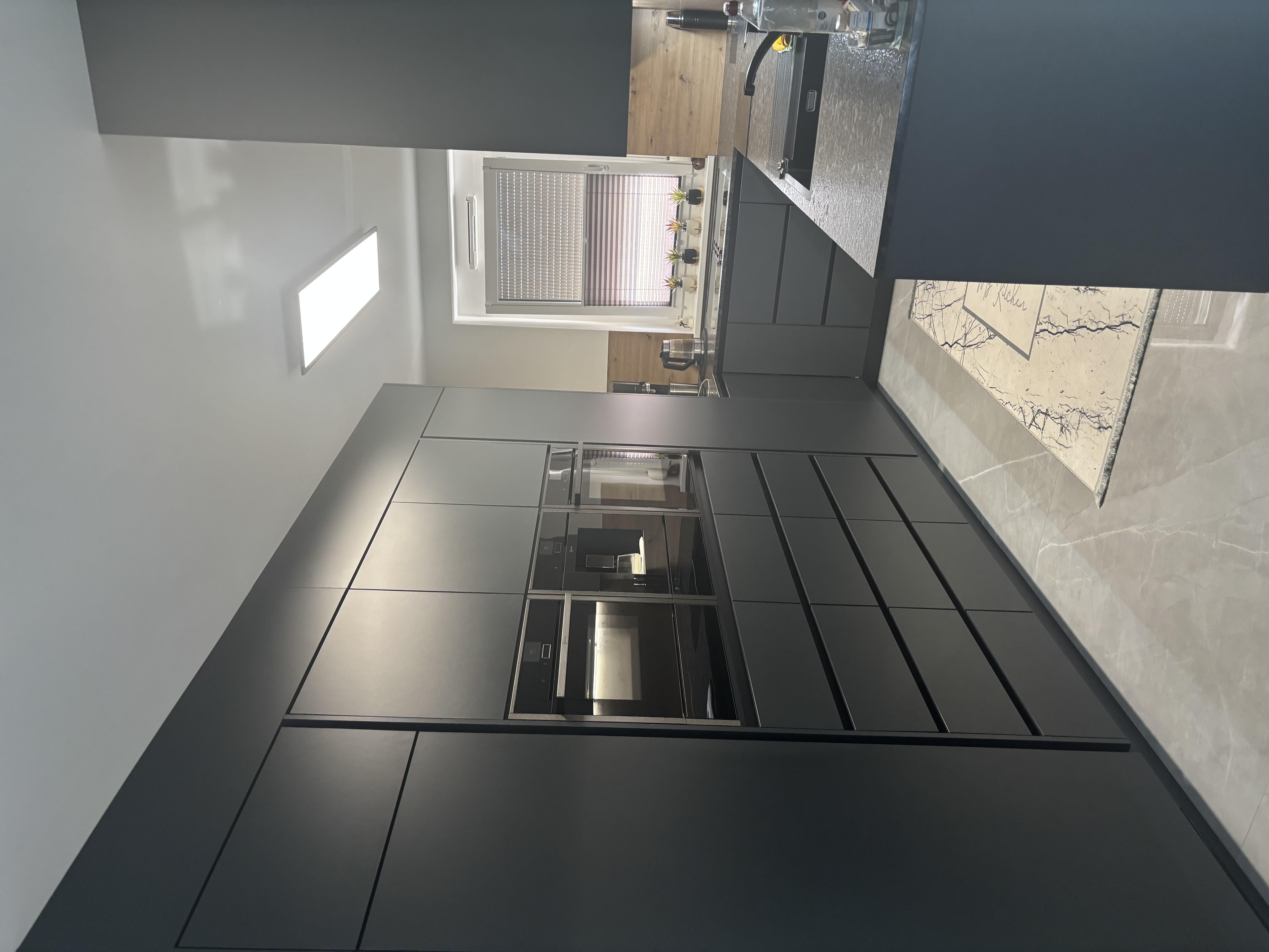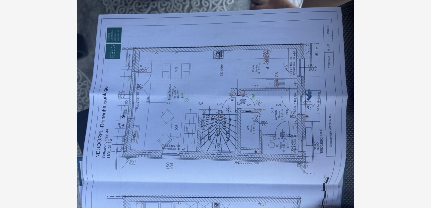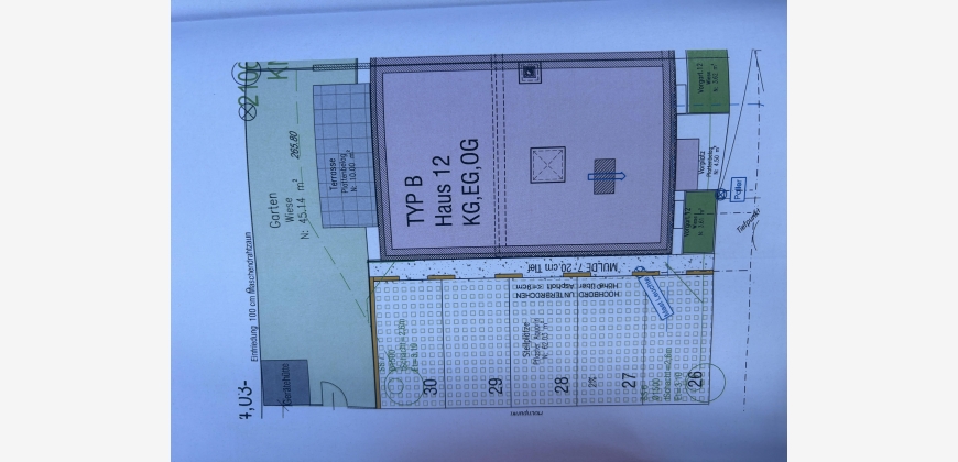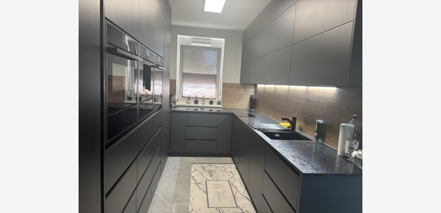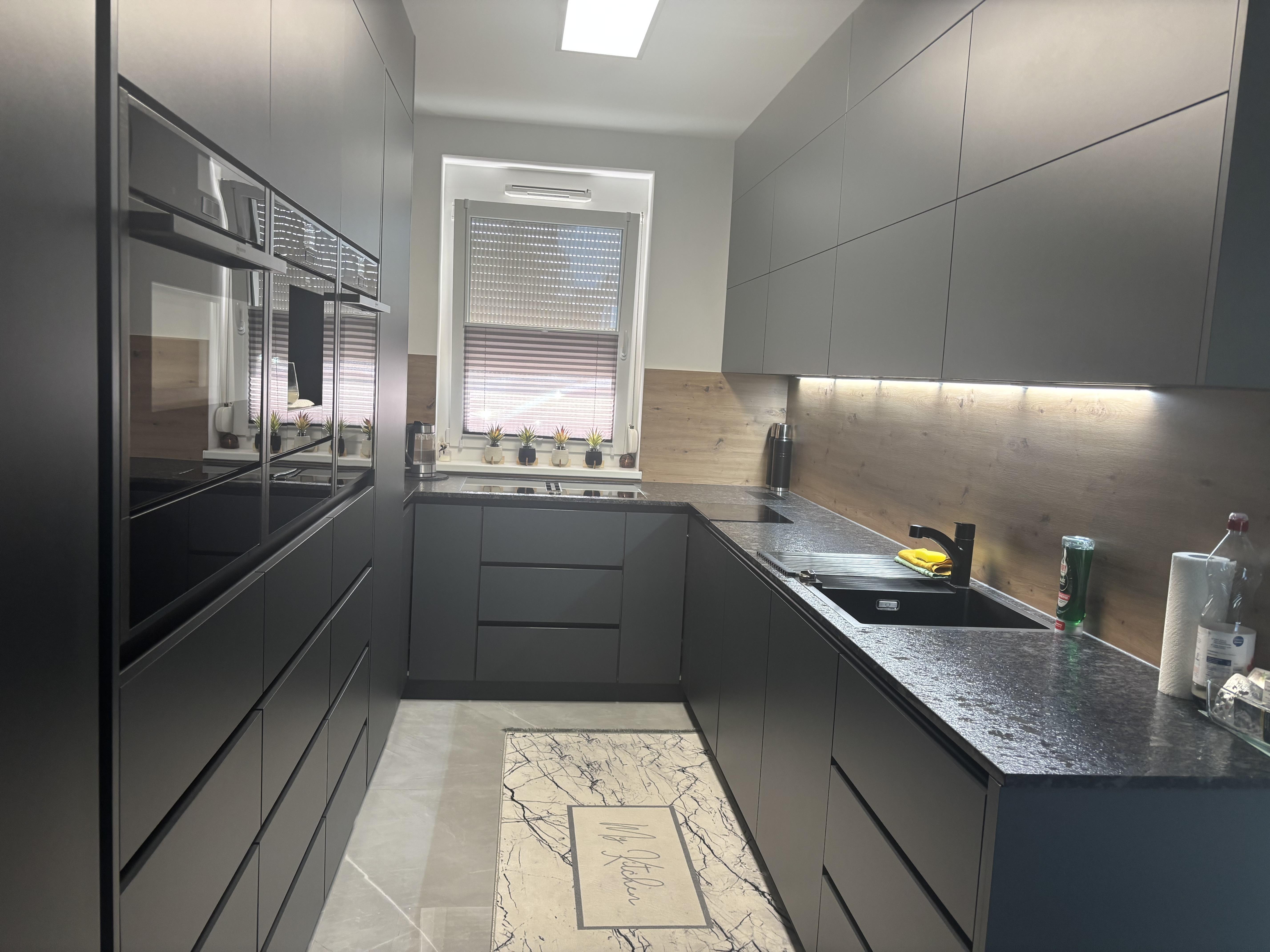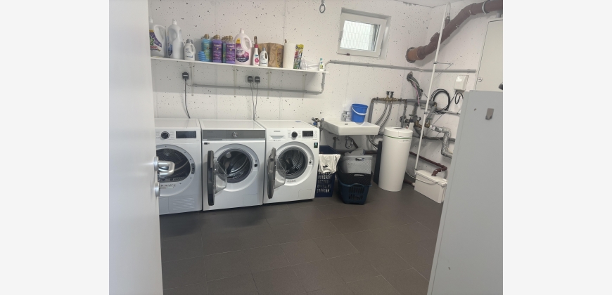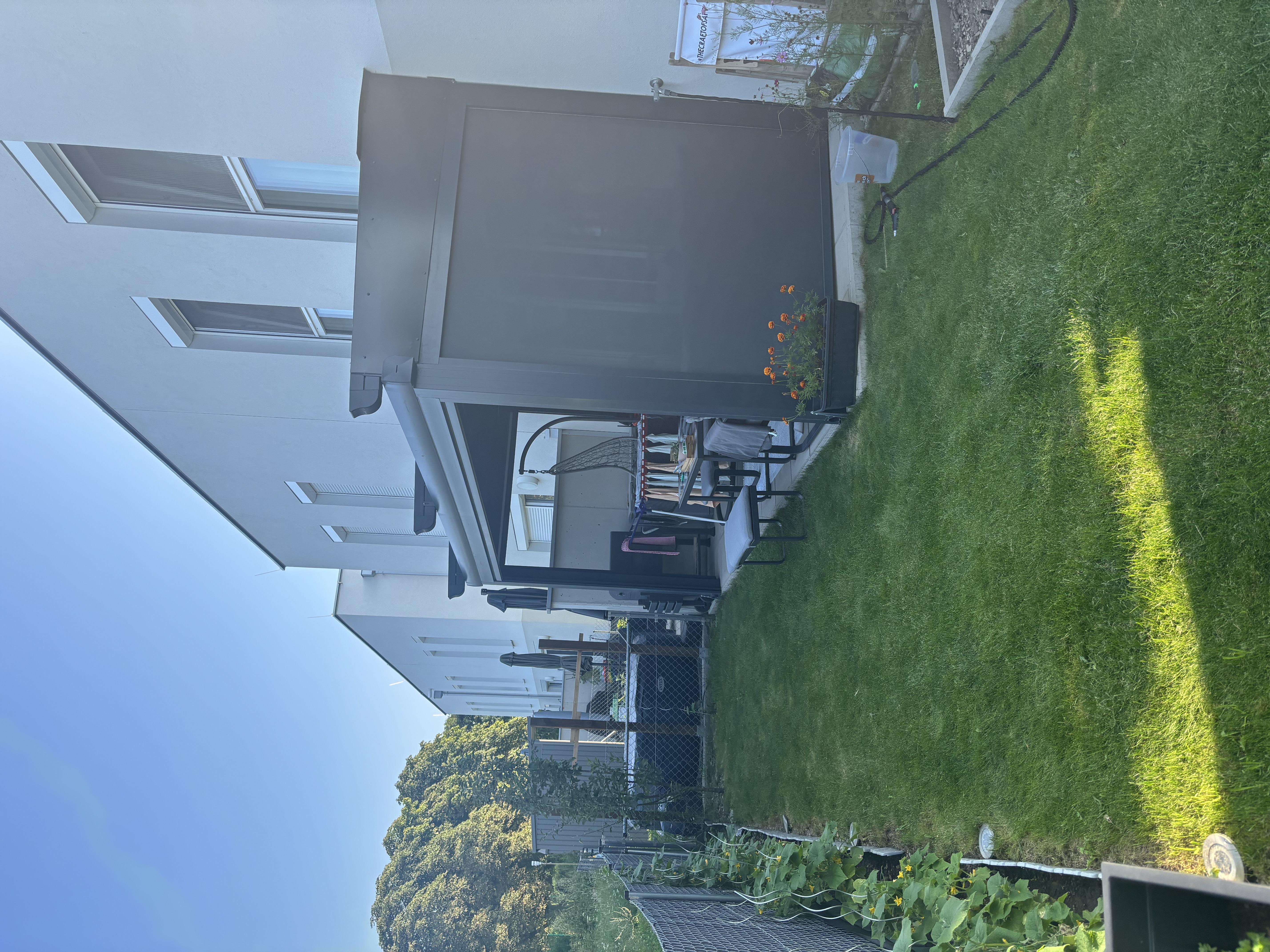 Großzügige Wohnküche mit maßgefertigter Einbauküche im Wert von ca. 50.000 €, Vorraum, WC und Garderobe. Im Kaufpreis enthalten sind alle Einbaumöbel (Küche, WC-Möbel, Garderobe im Vorraum) sowie eine elektrische Pergola im Garten. Böden: Fliesen.