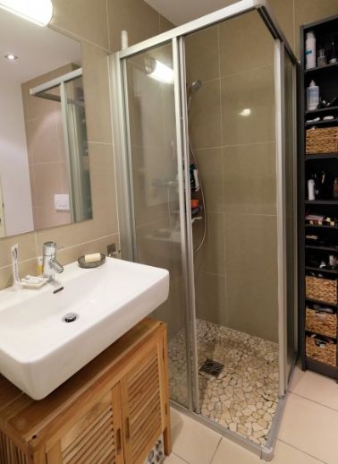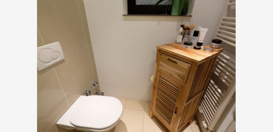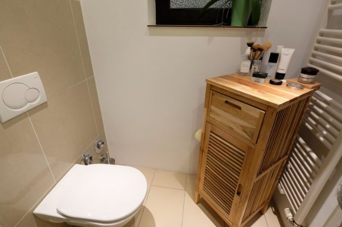 'Klein aber frein' beschreibt das Badezimmer sehr gut, die beigen Fliesen geben einen Hauch von Wellness-Feeling.